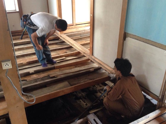 当初の計画では、一からプロの大工さんの手を借りずに、自分たちのみで改築を進めようとしていましたが、床の下地づくりで苦戦しています!