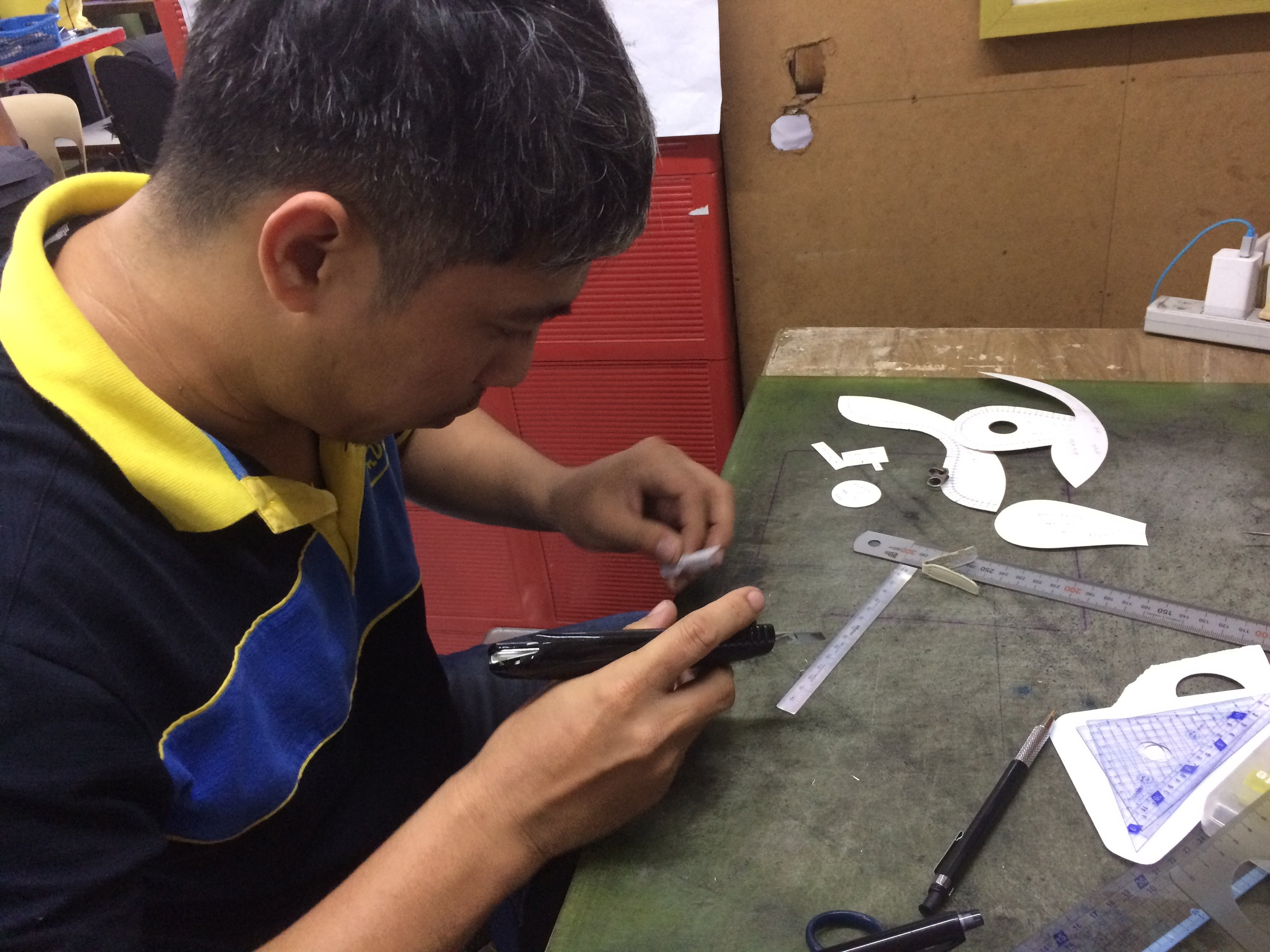 追記:コバ塗用のコバ液だけはフィリピン仕様がかないませんでした(>_<) 。タンナーから薬品を貰い調合したのですが、膨らみ、光沢感、タック(ベタ付)等の問題からコバ液だけは日本からコロンブスを取り寄せました。サンプルの型紙を作るロドリゴさん。曲線の出し方が本当に上手いです。