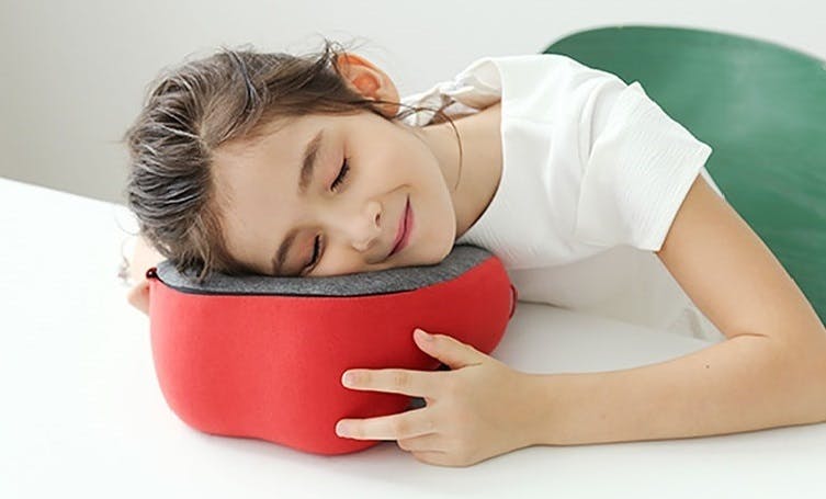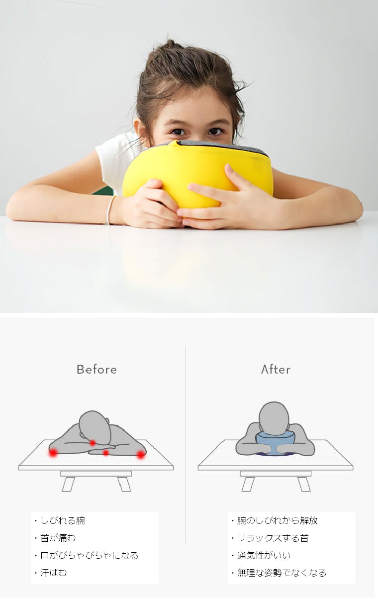 中央にくぼみがあることにより、顔にぴったりとフィットし、リラックスした状態でナップ(昼寝)できます。この枕の曲線やあらゆる角度は子供に合わせて調整されています。顔をうずめて寝ても目に当たらないデザインで目を弛緩させ疲労を取り除き、子供たちをリフレッシュさせます。