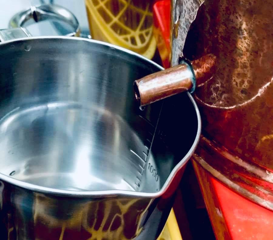 小型の銅製ポットスティルにて湯浴式でゆっくりと蒸留 加水して度数を調節し、砂糖で甘味を軽くつけて調整。