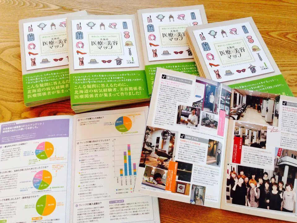 脱毛時に使用するウィッグのメンテナンスや再度毛髪が伸びて来た時の対応方法の相談に乗ってくれる美容室などの紹介などの「困った!どうしたらいいの?」に答えるために病気経験者、美容関係者、医療関係者が集まって作り上げた「医療×美容マップvol.1〜札幌編〜」。