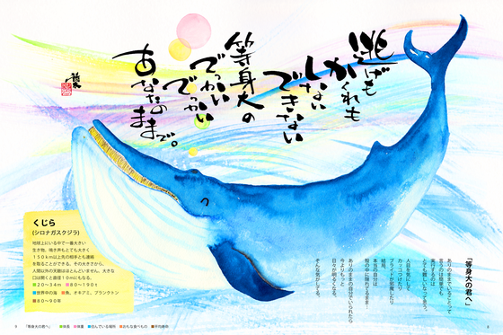 (↑図鑑、見開きページのイメージ図です。例「くじら」)