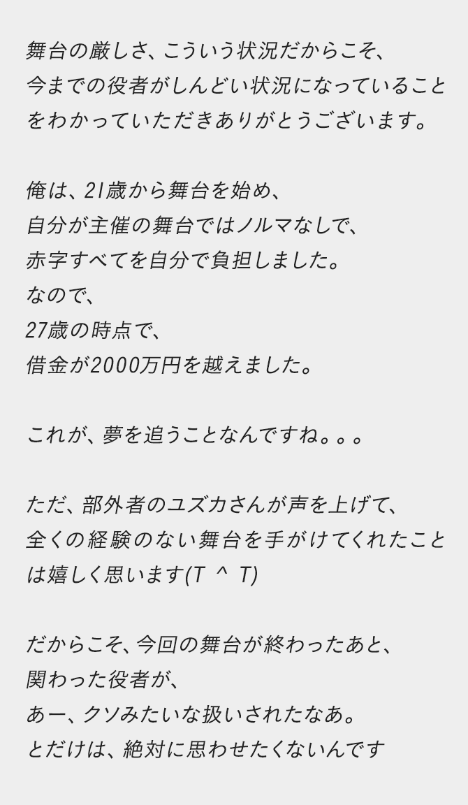 おそらく多くの舞台役者は、考えるのを辞め、とにかく目の前の借金をどうにかすることと、バイトや舞台をこなすことに、専念します。