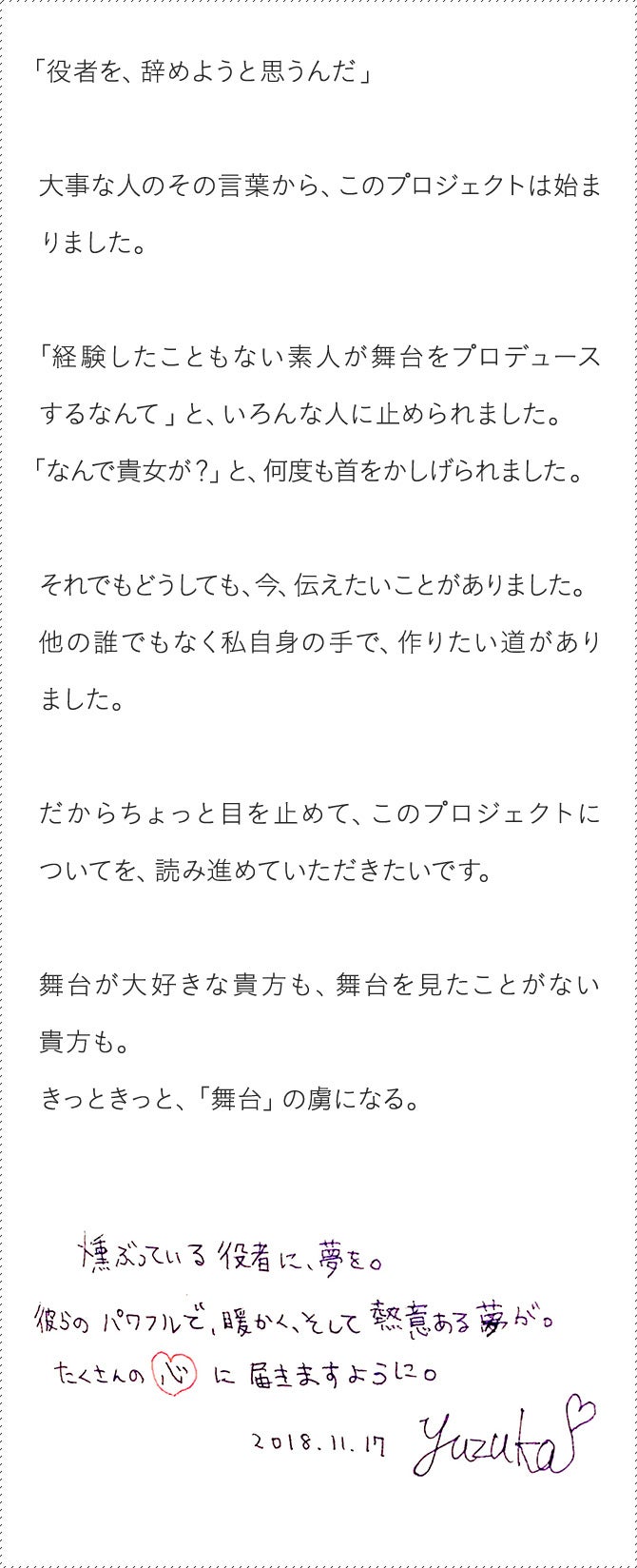 2018/11/30 22:53皆様のご支援のおかげで、クラファン開始4日目。100万円を達成しました。言葉が見つかりません。ただ、この100万円は「善意」が形になったものだと思っています。「夢」が、形になったものだと思っています。皆さまに最後のお願いです。400%達成まで、残りわずか。と同時に、クラファンの残り時間が、70分をきりました。もう、何も言いません。ただ、見に来てほしいです。何かにもめるたび、ぶつかるたび、諦めようとするたび。主演の堤下さんを含めた役者さんたちに、何度もかけられた言葉があります。「だけど作品は、めちゃくちゃ面白いんです」脚本、見ました。お芝居も、届きました。多分終わったあと、立って拍手がしたくなるくらい、めちゃくちゃ面白いものが仕上がっています。私はみなさんに、この作品を、どうしても見て欲しい。「演劇」はまだまだ課題があるけど、この舞台が終わったあとも、私はまだ、投げ出すつもりはありません。まずは、一歩。まずは皆さんに、「演劇」の良さを体感していただきたい。お願いします。劇場に、来てください。残り70分、悩んでいる誰かの心に、この言葉が届きますように。yuzuka大好きで尊敬するデザイナー、井上祐一さんと、コピーライター、長谷川哲士さんが手がけてくださったチラシ。たくさんの人の思いが、この舞台には詰まっています。yuzuka もっと見る