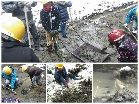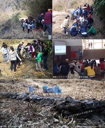 2017.03.19 奈良市青少年野外活動センタとのコラボ企画として、当基金が大柳生地区で進める自然再生事業を実際に体験頂ける機会を設けました奈良市環境教育フェスタ(2017.02.12)を受けてのアンコール企画です 小学校低学年×25名、学生を中心に大人×27名が参加。自然再生サイトに突如15mを超えるバケツリレーの列が出現しました泥を堀り、バケツをリレーし、堤を積み上げ、あぜを塗り、瞬く間に約6mのあぜが完成です参加者は全員、これが生きものたちの棲処を創るための作業の一環であり科学的な理論に基づく手段である、というレクチャーを事前に受けていますその甲斐あってか、子供たちからは「これでカエルが卵産めるようになんねん」「ドジョウもでてきたらええのになぁ」といった発言が口々に聞かれ、生きものたちのためにという動機付け、目的と手段、或は、理論と実践の関係性についての意識付けが図られているようすが伺われます加えて、土に触れる・生きものたちのために何かをするというのは、大人たちにとってもなかなか経験できない体験だったそうです