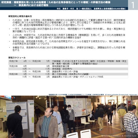 2017.03.05 地域自然史と保全研究発表会2017(於:大阪市立自然史博物館・主催:関西自然保護機構)において、「環境要因を用いたため池環境(ため池の生物多様性にとっての環境)の評価方法の構築 ~ 奈良県内における試行報告」と題して研究発表を実施致しましたこれは、大阪市立自然史博物館の外来研究員として一昨年から継続研究中の「近畿地方中部のため池の水生・湿性植物の分布」「近畿地方中部において自然再生効果の高いため池(ポテンシャルハビタット)の抽出」という研究の途中経過をまとめ昨年に引き続き報告したものです本研究報告では、奈良県内のため池における実地調査結果(14タイプ46箇所)を用い、評価手法を検証し、課題抽出を行った内容を報告しています詳細は当基金サイトをご覧下さい