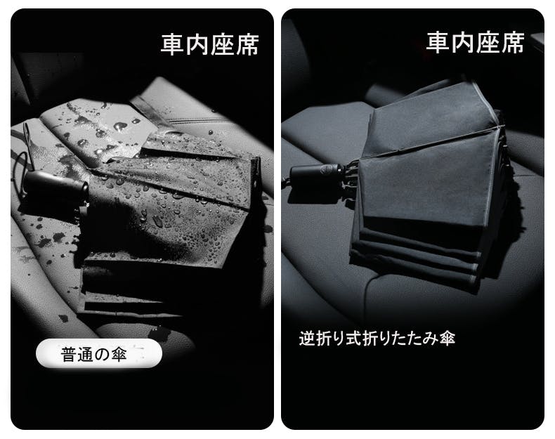 ❶.1秒自動開閉の逆折り畳み傘は、濡れた傘のわずらわしさを解消されます。