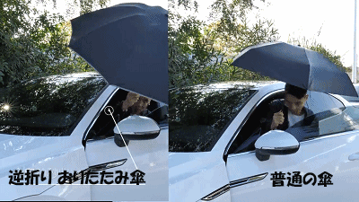 傘を畳むと濡れる部分が内側に!外側が濡れないので他人に迷惑をかけません。車や家から出る時に傘をさしやすく、便利です。
