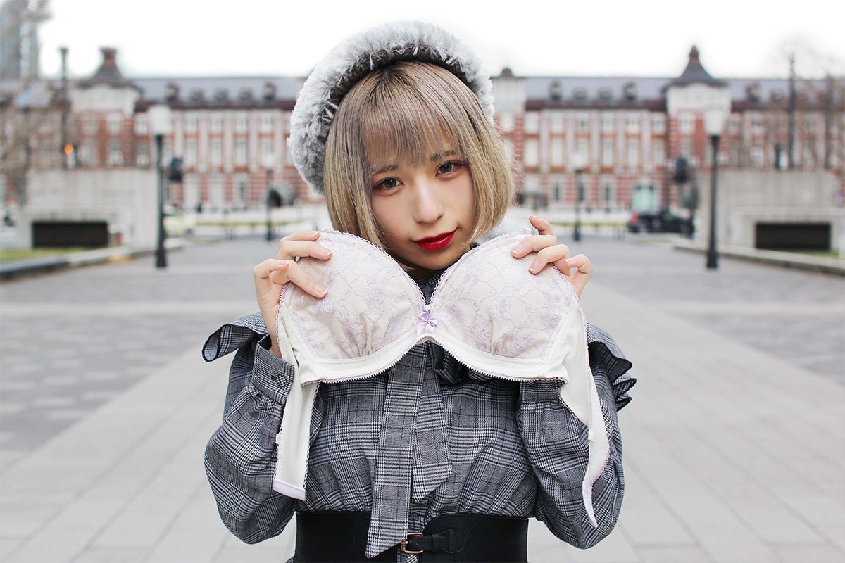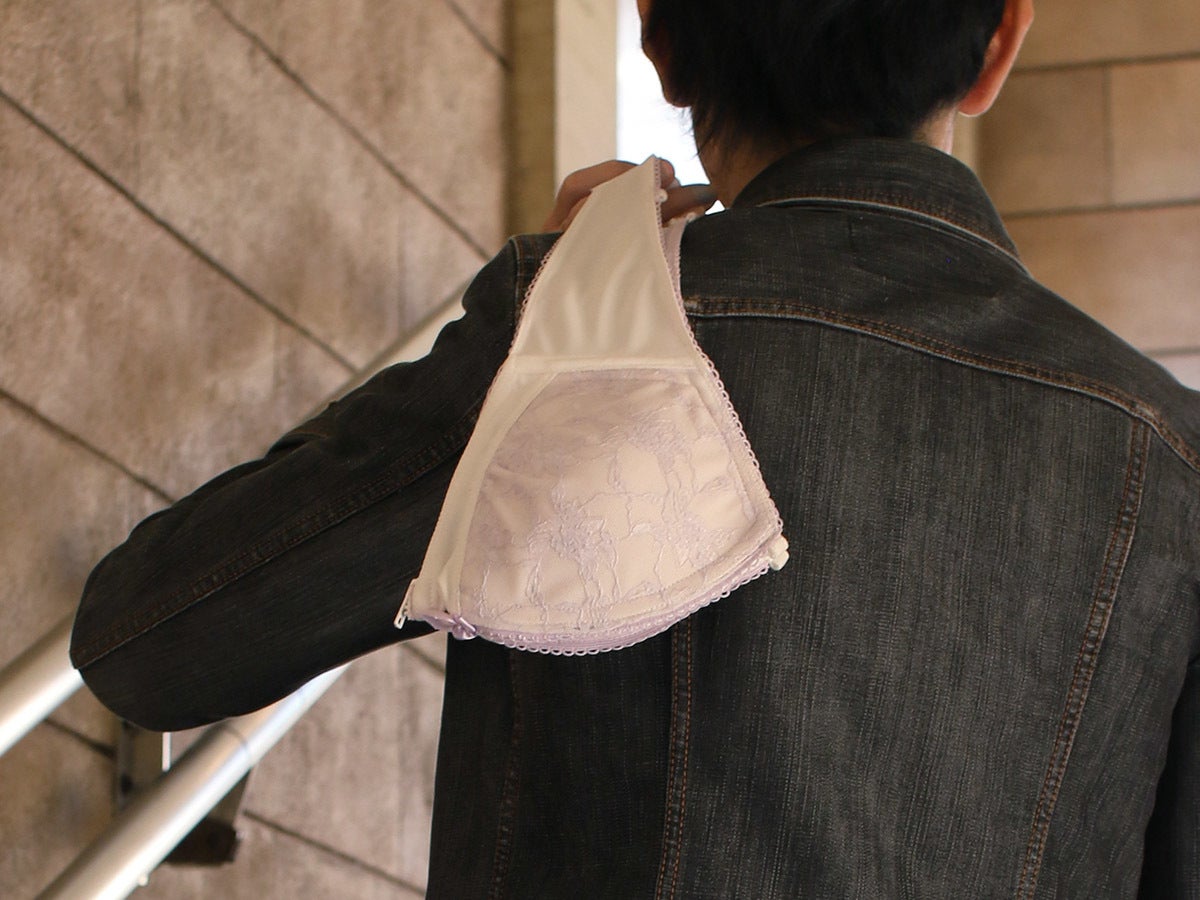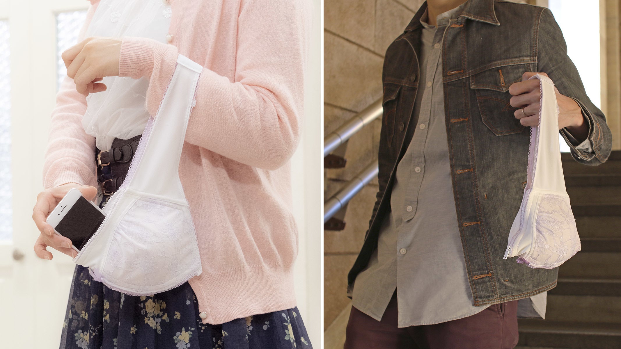 弊所ではこれまでに「妄想マッピングTシャツ」や「タニマダイバー」など、胸元をモチーフにした作品を度々制作していました。それらのプロモーションにあたり撮影衣装として用意したブラを複数所有しており、作業場にブラが当たり前のように転がっている時期がありました。その頃、ちょうど一眼レフカメラを持って出かけようとした際に交換用レンズをしまうケースが見当たらず、とっさに転がっていたブラでレンズを包んで持ち運んだことがありました。その時、包み込むのに適した立体形状や、クッション性のあるパッドが内蔵されているブラがポーチとして如何に優れているかを実感しました。