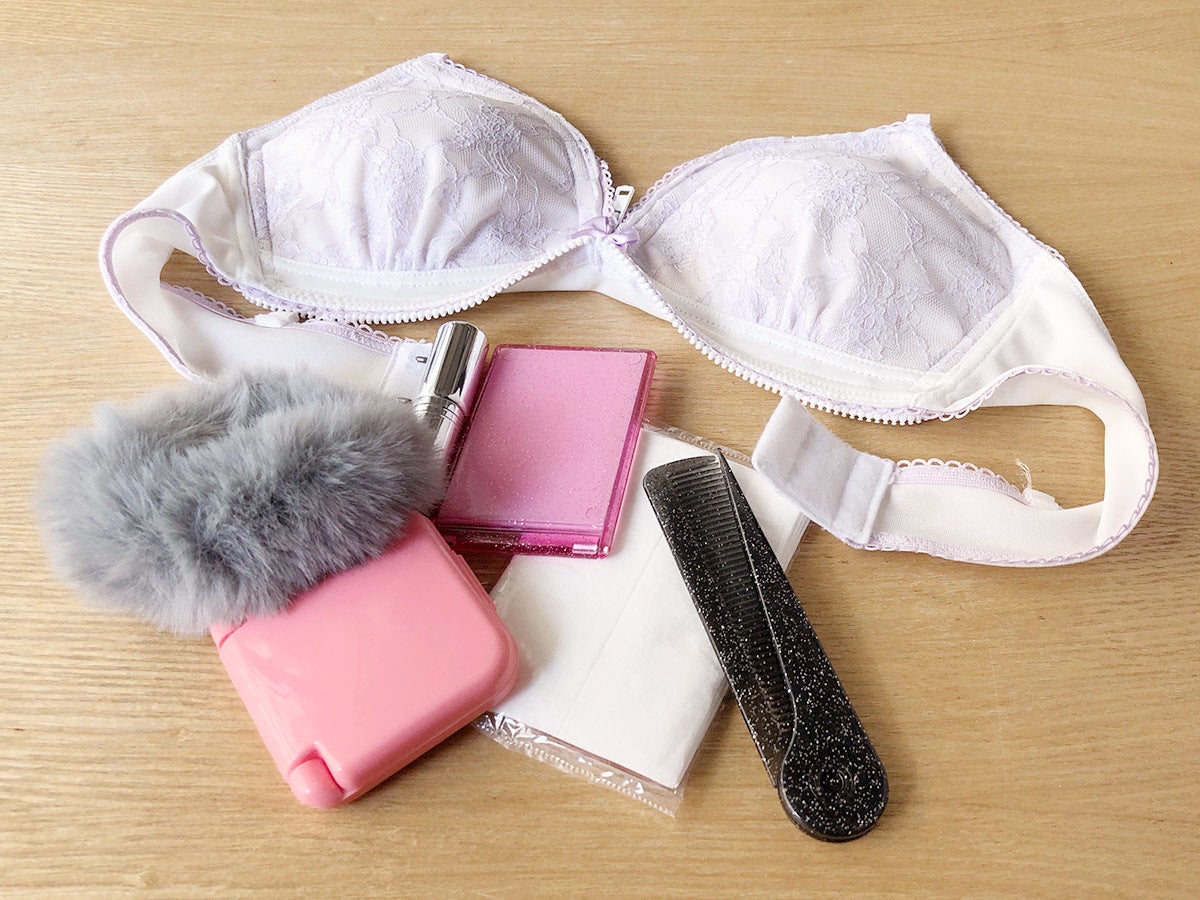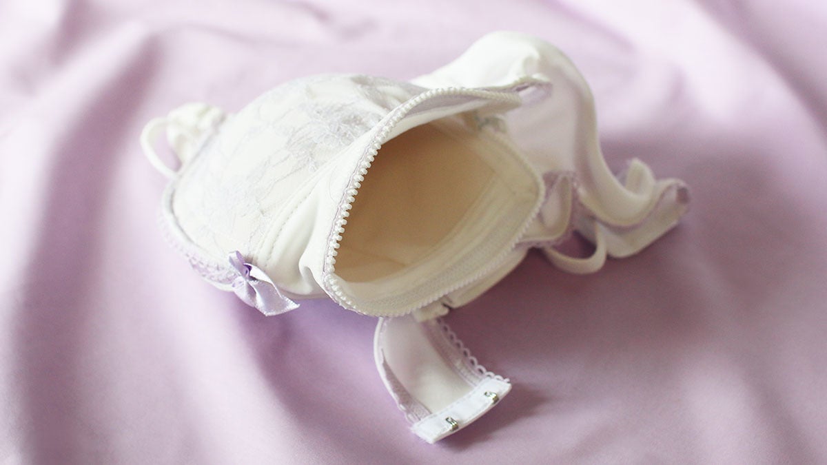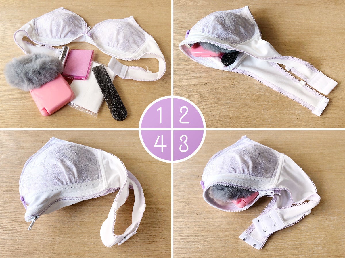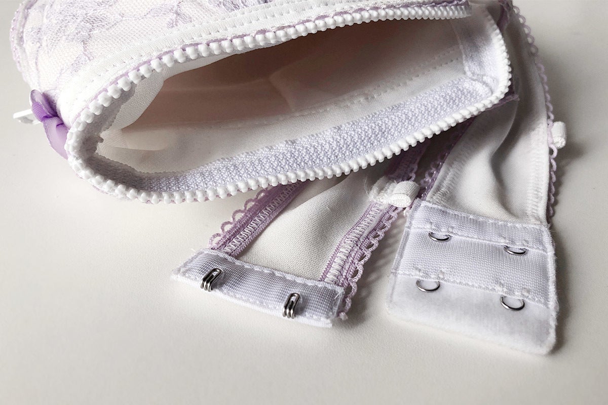実際に下着として使用するものとほぼ同様のブラジャーをベースに、ファスナーを取り付けて閉じられるようにすることで、ファッションアイテムとして持ち歩くことのできるポーチを実現しました。