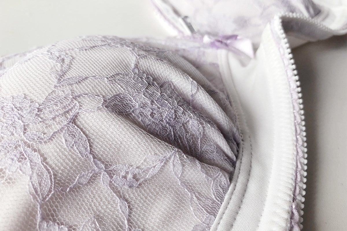 白をベースに淡い紫のレースを配したブラポーチのディテール