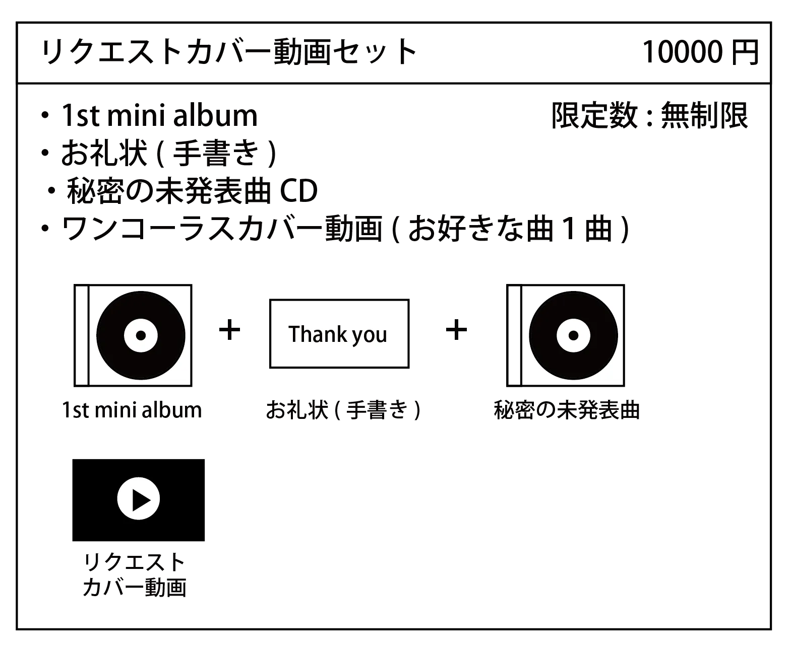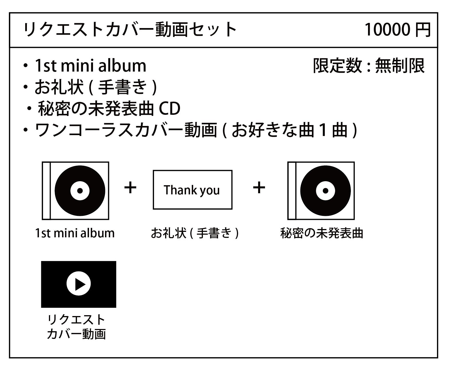 今回制作する1st mini albumに様々なオプションをお付けします!リリースイベントへのご招待なんかもあります!また、クラウドファンディング限定で、未発表CD-R、あなたのお好きな曲をカバーした動画、テーマをいただきワンコーラス作曲した動画、あなたの街まで歌いに行く出張路上演奏など!