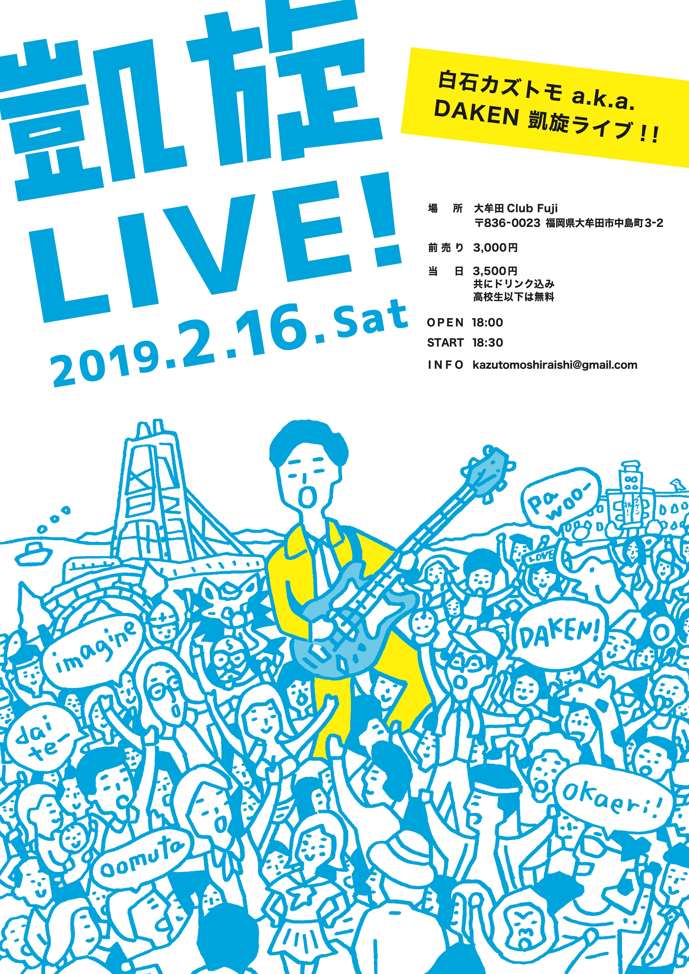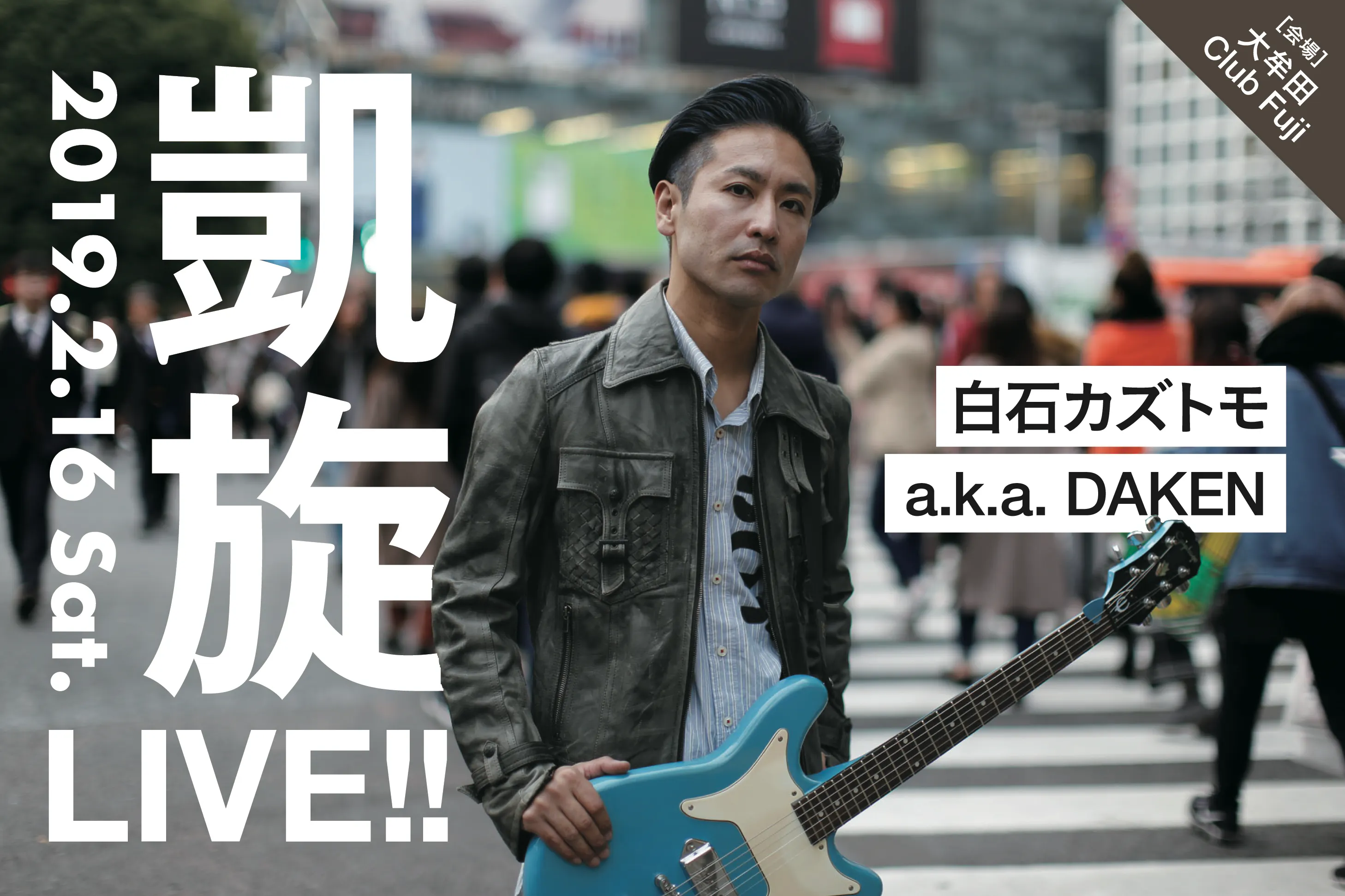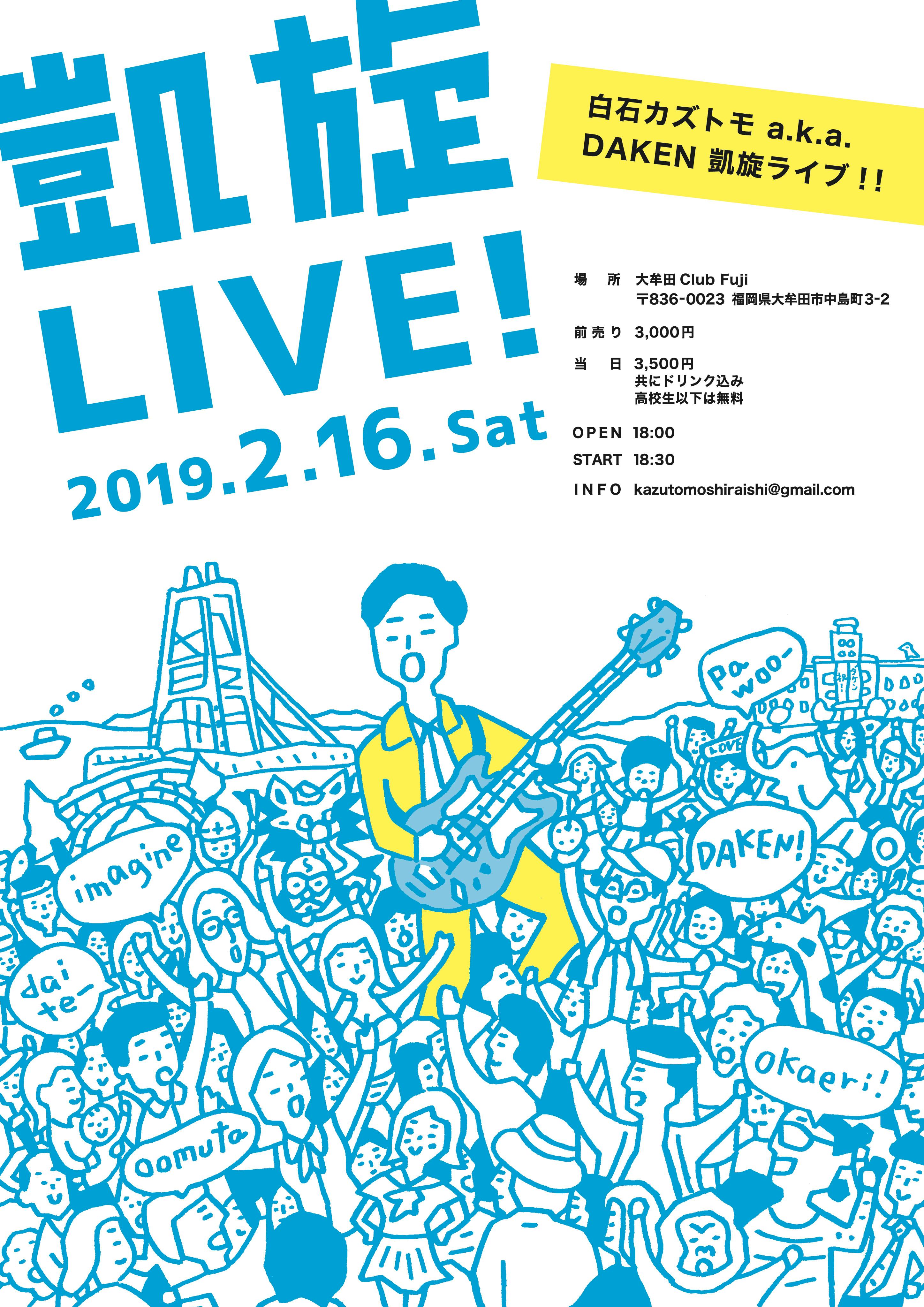 2019年2月16日(土)大牟田Club Fuji で行われる、白石カズトモ a.k.a DAKEN 凱旋ワンマンLIVEのチケットを贈ります。