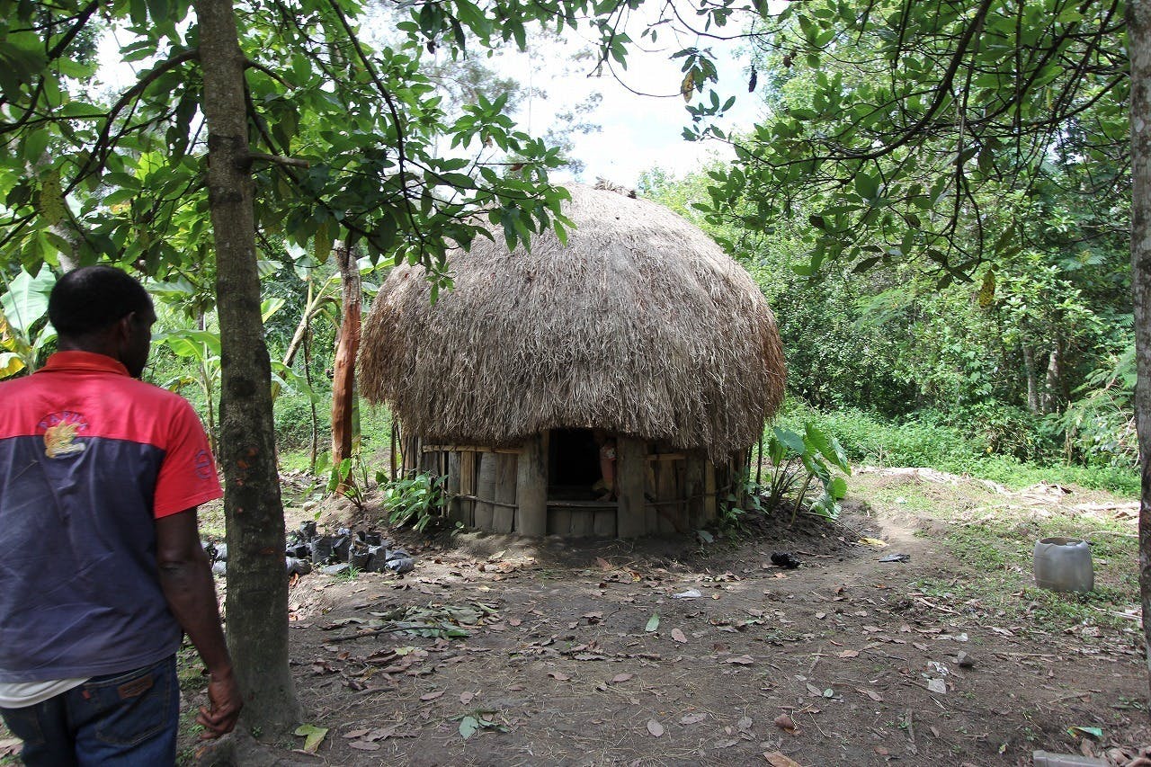 インドネシア・パプア州のアントンさんのコーヒー農園。彼らは貧しく電気、ガス、水道も無く、子供3人は学校へ行けません。ここに脱穀機などの設備支援をすることで、彼等から直接生豆が購入でき、経済的支援が可能になり、子供達が学校へ行くことが出来ます。そして、岩下珈琲もより良いコーヒービジネスが出来ます。