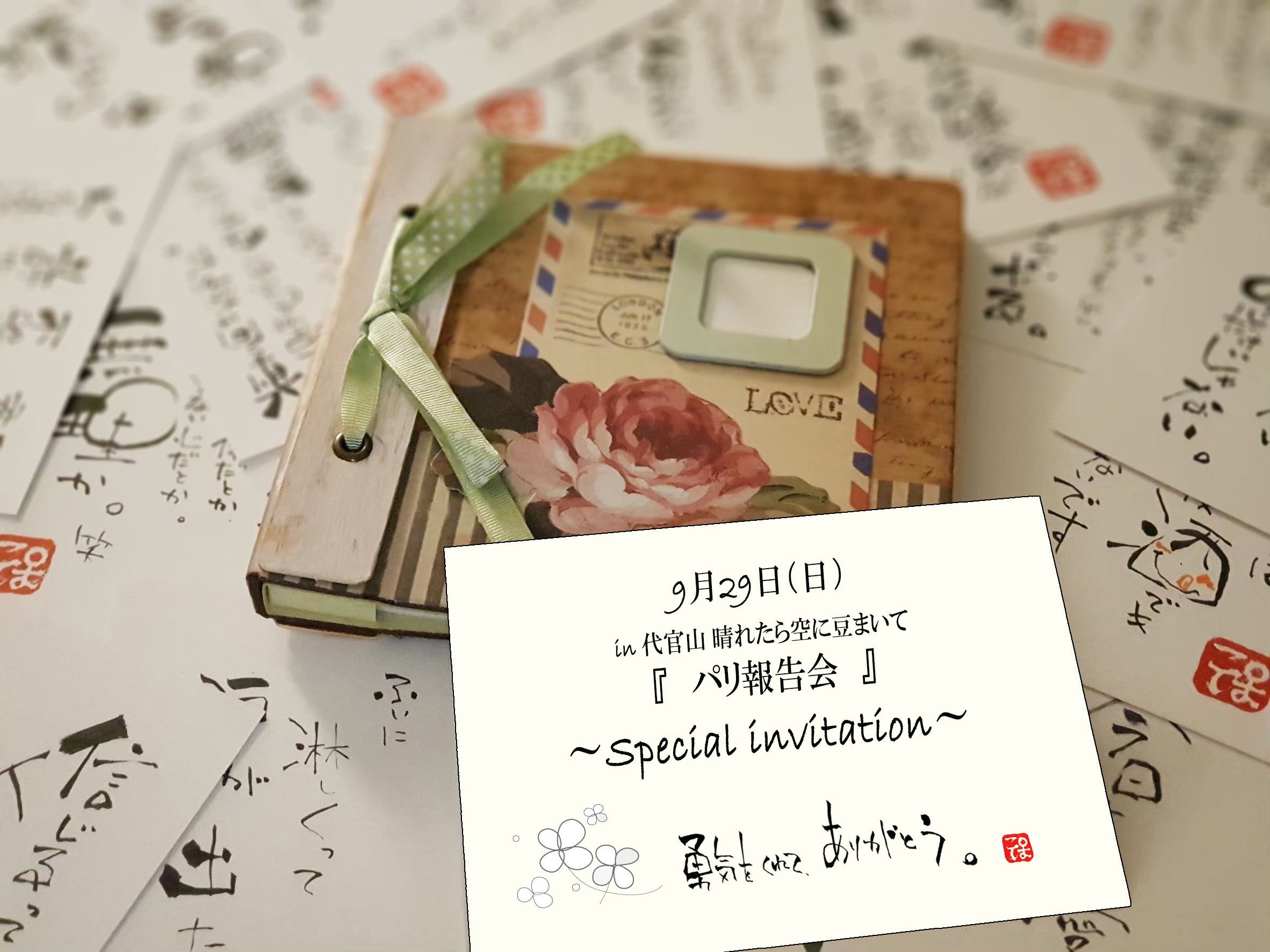 2019/07/07 07:05Japan EXPO2019いよいよ現地にたどり着きました!!!和響座メンバーと一緒に向かった道のりはなかなかなトラブル続き…メンバーの和太鼓が現地の空港で紛失したり(現在は見つかりました~!)ステージで使用するアルミ刀が空港で引っかかり、警察沙汰になったりと。笑一筋縄ではいきませんでしたが、トラブルも楽しみつつ超えることが出来ています。魔法の本最後の仕上げまず行ったのは50種類のポストカードをアルバムにいれる作業。これは一人では到底できなかったので和響座メンバーが積極的に手伝ってくれて本当に助かりました!!!!実際には40枚入りのポストカード。本によって入っている言葉が10枚ほど違ってきます。どんな言葉がその人の手元に届くか、それも含めて「ご縁」になると思っています。ご支援いただいた皆さんのお名前それから本の説明書やご支援いただいた皆さんのお名前を手紙として添えていく作業。これはメンバーも寝静まった夜に一つ一つ折り入れていきました。お名前のひとつひとつひとつ手紙にする時、友人の名前や知人の名前。私がまだ直接会ったことのない人の名前。たくさんの名前を記していけることがとても嬉しかったです。少しずつ渡る魔法の本実際に現地の出展ブースで少しずつ出会った方に魔法の本を渡しています。表紙にはその方のお名前を記載しています。不思議そうな顔をしながら受け取ってくれる皆さん。受け取って出さった方の本は、10年後にはどんな風に変化していくんだろう。明日が7/7が最終日。どんな人に渡していけるか楽しみです!!!! もっと見る