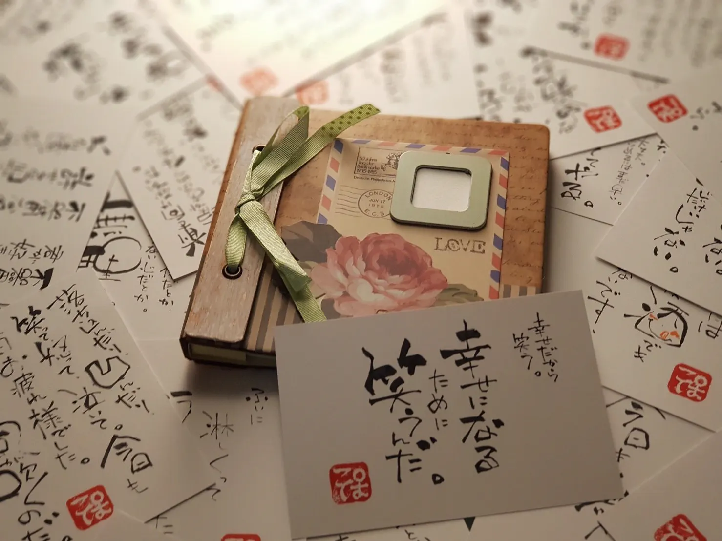 フォトアルバムに一枚一枚手書きの言葉を入れて、