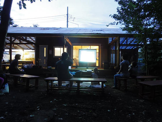▲ロッジをスクリーンにして、ベンチを並べます。小さなスクリーンですが、音にはこだわっています