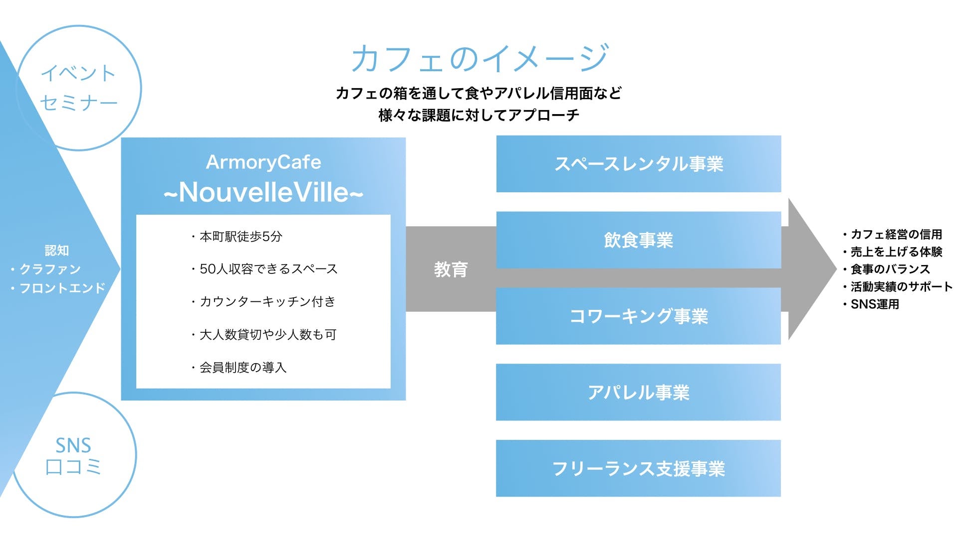 ・事業づくりに興味のある人(カフェ経営やコミニュティ事業、アパレル事業を展開するため)