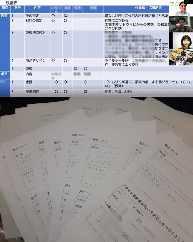 熊本・岡山の皆さんとはオンラインでやりとりをして、それぞれの分野の持ち味を活かしていただいています。オフラインでは、倉敷芸術科学大学・芦田研究室の学生の皆さん(youngなご意見) や地域の農産加工品等のアドバイスに長けている吉備中央町商工会の皆さん(adultなご意見) に試食いただき、アドバイスを得ながら開発を進めています。