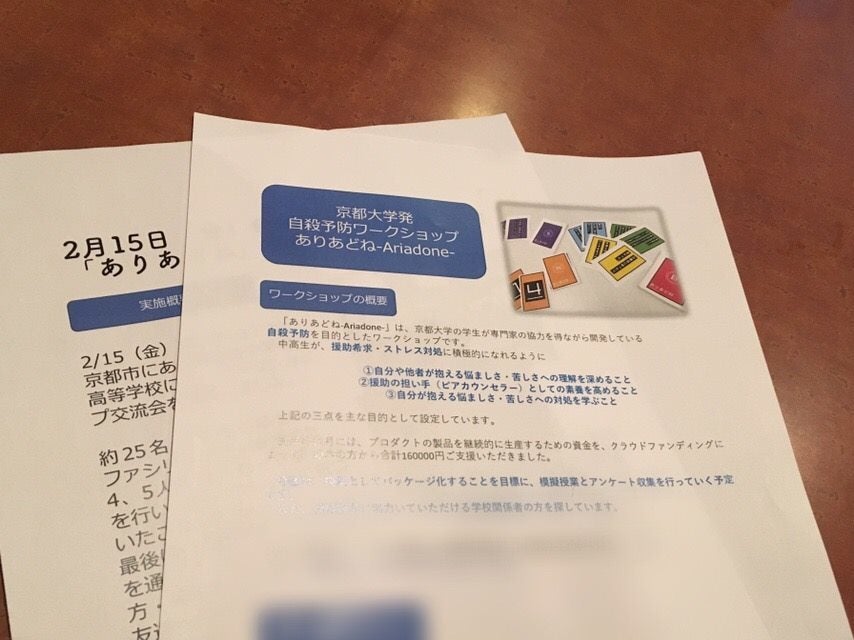2019/10/21 18:31お世話になっております。チーム「ありあどね」です。直近の活動と所属について三点ご報告させていただきます。①2019年 9月7日(土)、9月8日(日)愛知県で行われました日本自殺予防学会にて、ポスター発表を行い、多くの方々と意見交換を行いました。②2019年9月上旬 京都にある同志社中学校にて、中学二年生の8クラスに自殺予防教育の授業を行わせていただきました。多くの生徒さんが、カードゲームを通してメンタルヘルスについての学びを深めることができました。今後は、アンケートの結果の分析を行い、授業案の今後の改善に努めてまいります。③チーム「ありあどね」の今後の所属について今年の4月から、チーム「ありあどね」は、NPO法人 日本教育再興連盟に所属し活動を行なってまいりましたが、今後は別の組織として活動していく運びになりました。今後も、多くの方々と協力し、活動を続けてまいります。今後ともよろしくお願いいたします。 もっと見る感謝状及びお礼のメールの内容に関する訂正