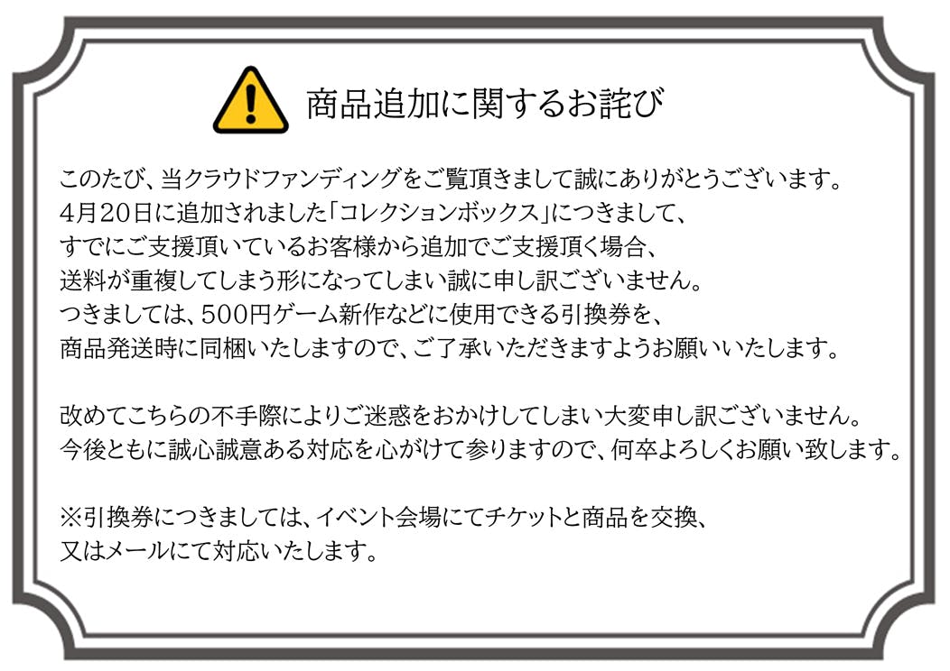 一般販売分のコレクションボックスの発注資金に支援金を一部を使用いたします。