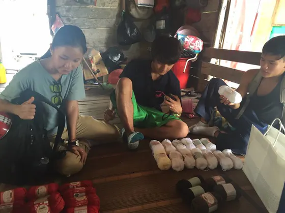 fisher islandにてアクリル毛糸を数えて、渡している様子。日本とベトナムの国旗をデザインしたアクリルたわしを作ってくれるようなので非常に楽しみです!