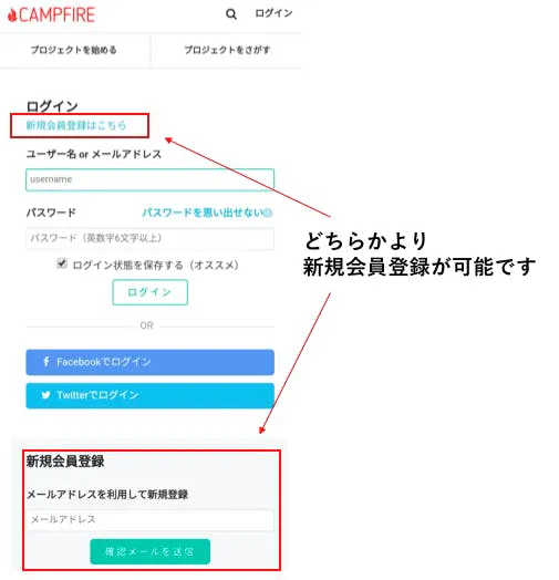 こちら(https://camp-fire.jp/login) の新規登録画面より、会員登録へお進みください。