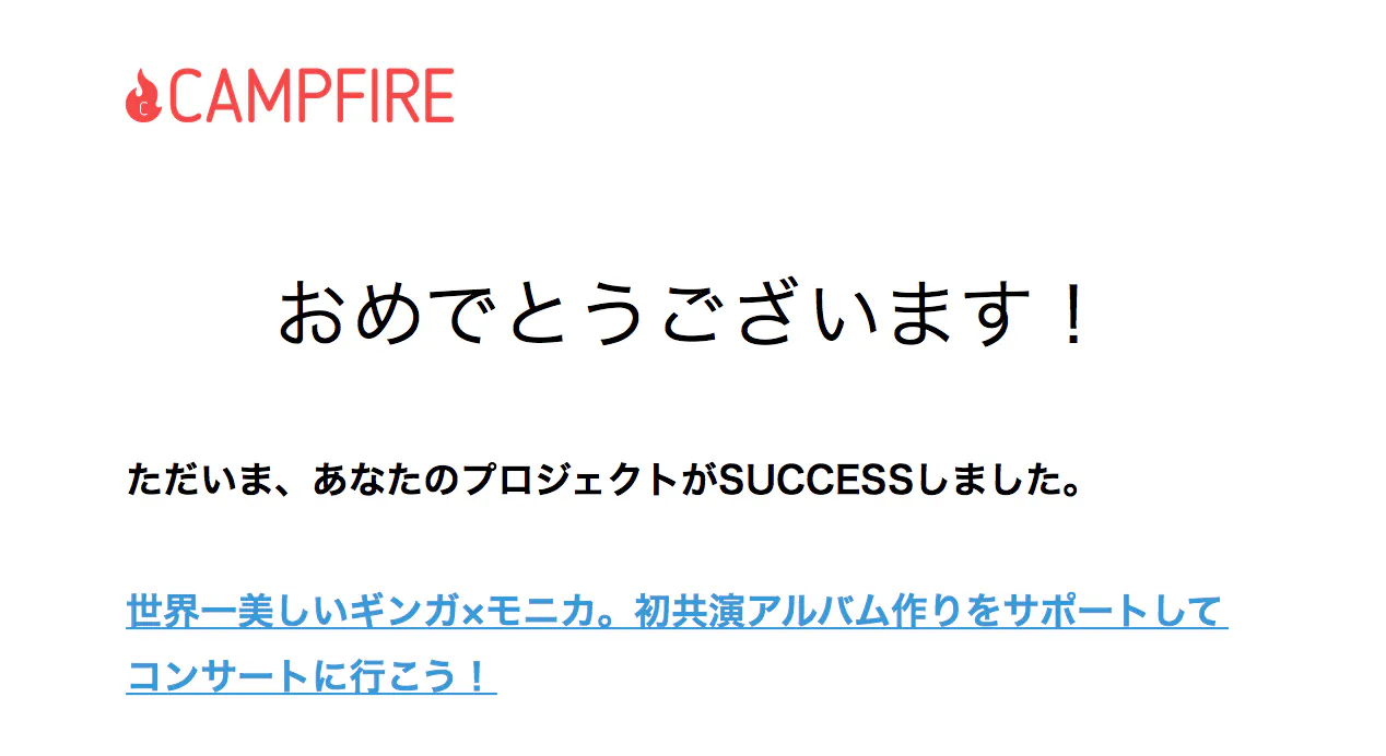 2019/01/08 10:36ご支援いただいた皆様 おはようございます! この度は「世界一美しいギンガ×モニカ。初共演アルバム作りをサポートしてコンサートに行こう!」に、ご支援賜り誠にありがとうございました!実行委員会一同、心より御礼申しあげます。 昨年末まで正直絶望的で、既にご支援いただいた皆様にどのようにお詫びしたらよいか頭を悩ませていました。 しかしながら、多くの方々が温かいお声をかけて下さったおかげで、お詫びの方法を考えるよりも、まずは最後まで信念を曲げずに諦めないでやり抜くことが、皆様のご好意にお応えすることだと心改め、我武者羅に駆け抜けました。 それが皆さまに届いたのでしょうか? ご支援いただくと私たちの元にメールが届くのですが、終盤パソコンから受信メールのお知らせがピコンピコン鳴りやまないではないですか!? もう夢かと思い何度も頬っぺたを抓りました。あれよあれよというまにご支援がうなぎ上り。終了17時間前には目標金額を達成。それでも鳴りやまないメール受信の音。最後の最後23:59まで鳴りやむことはありませんでした。人生でこれほどメール受信音が愛おしく感じたことはありません。 終了まで1時間となったときに、ギンガの作品でもリズミカルなバイァオンの曲を聴きながらカウントダウンしていたのですが、皆様からの寄せられるご支援の受信音とのコラボが素晴らしくて!動画を録っておけば良かったです…。 おかげさまで晴れやかな気持ちで終了の時を迎えることができました。 クラウドファンディングというのは、金銭的なご支援を賜るプラットフォームではありますが、実際にはSNSなどでの繋がりも相まって、皆様からの温かいお気持ちがどんどん集まって、一緒に夢を築き上げている一体感を感じられる現代社会ならではのツールなのだなと感じました。 皆様が、ギンガ、モニカ・サウマーゾ、テコ・カルドーゾ、ナイロール・プロヴェッタのアルバムを日本で作り、来日公演を成功させたいという夢を私たちと共有して下さり、夢を大きくして下さったのです。 今回のプロジェクトの成功は、私たちのみならず、普段から音楽の力を信じて切磋琢磨する多くの人々に希望を与えたと思います。 皆様と築き上げた音楽への愛が詰まったこの大きな輪を、もっともっと広げていきたいと思います。 まずは4月の来日ツアーを成功させるために、本プロジェクトで頂いた大きなエネルギーを糧に、実務に移行していきます。来日公演の会場をいっぱいに埋め尽くして、彼らをお迎え出来るように頑張ります。 今のところ、レコーディングはツアー終盤に行う予定なので、来日公演で彼らが皆様にお会いして、愛とエネルギーを受け取って、レコーディングに挑むことになります。 歴史的名盤を作りましょう! リターンに関しましては、一つ一つ経過報告をしながら、皆様のお手元にお届け致しますので、楽しみにしていてください。 長文になりましたが、この度は本当にありがとうございました! 引き続き、宜しくお願い申し上げます。 Muitíssimo obrigada a todos !!!ギンガ&モニカ・サウマーゾ来日公演実行委員会一同 もっと見る
