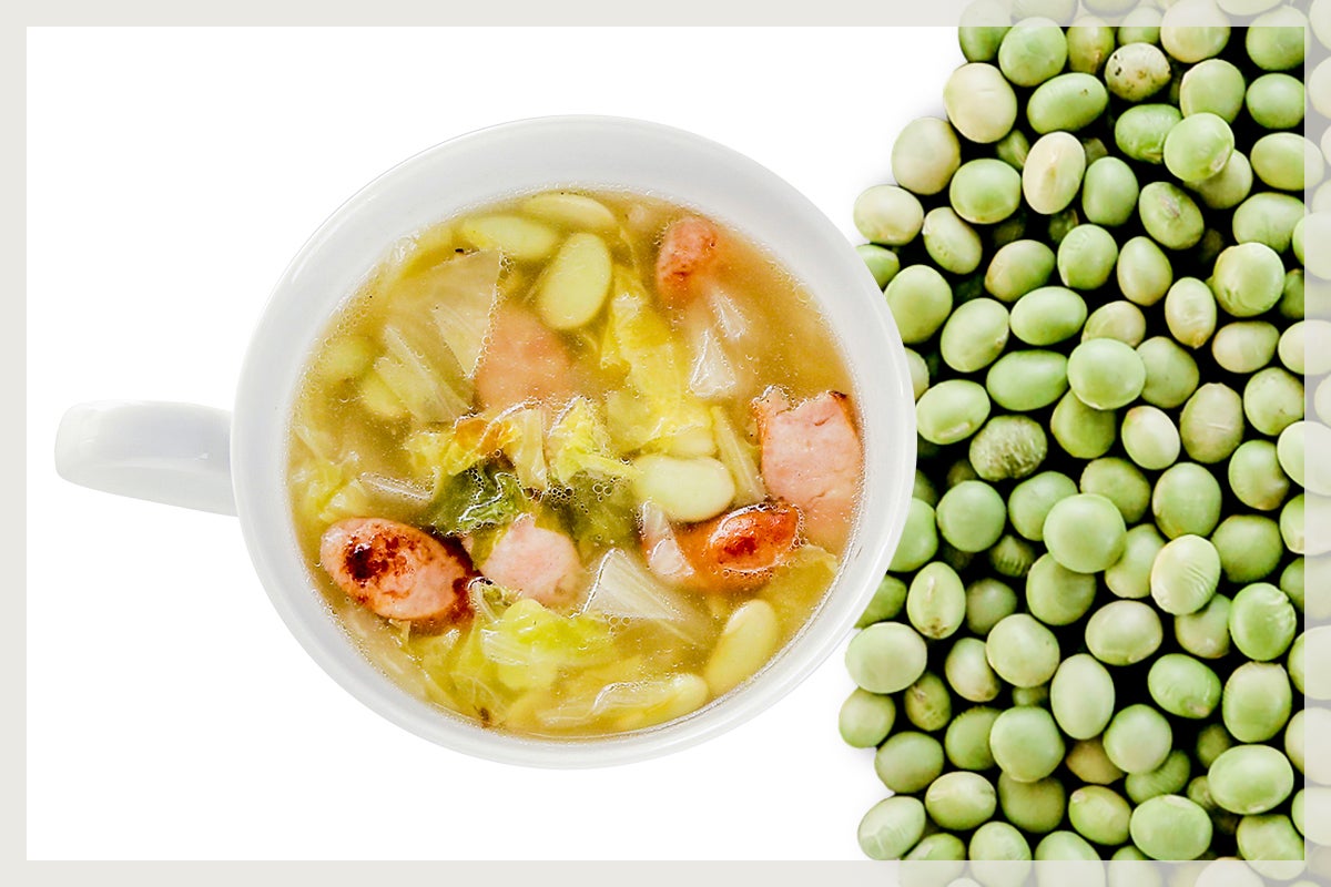あやみどりは、塩尻生まれの色鮮やかな青大豆で通常の大豆より味が濃く、旨味もたっぷり。自家製パンチェッタには、塩尻市で育ったSPFポークを使っています。さらに塩尻冬野菜の白菜を加え、じっくり煮込んで、コンソメベースのスープに仕上げました。