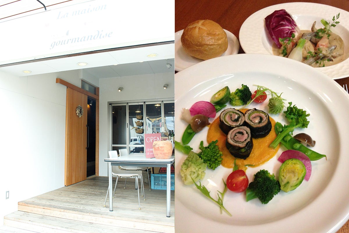 (左:店外観 右:SPFポークバラ肉ロールの菜園風と信州福味鶏のフリカッセ)