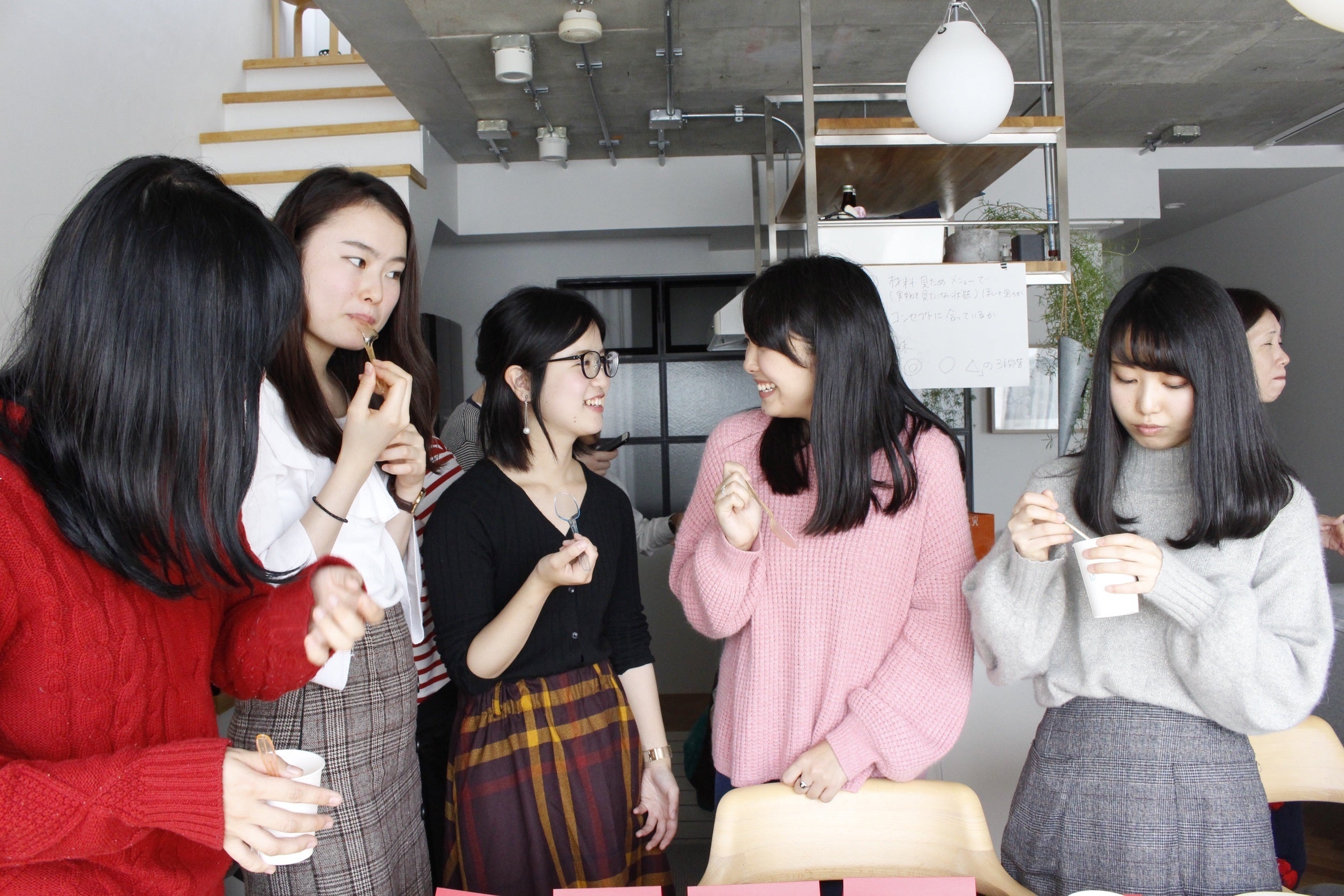 10月中旬には11種類のスープ案から5種類に厳選すべく働く女性にお集まりいただき、スープ試食会を行いました。全種類のスープを召し上がっていただきながら、「味」だけでなく “わくわくするか”、“幸せな気持ちになれるか” といった「こころの動き」にも着目して評価をしていただきました。