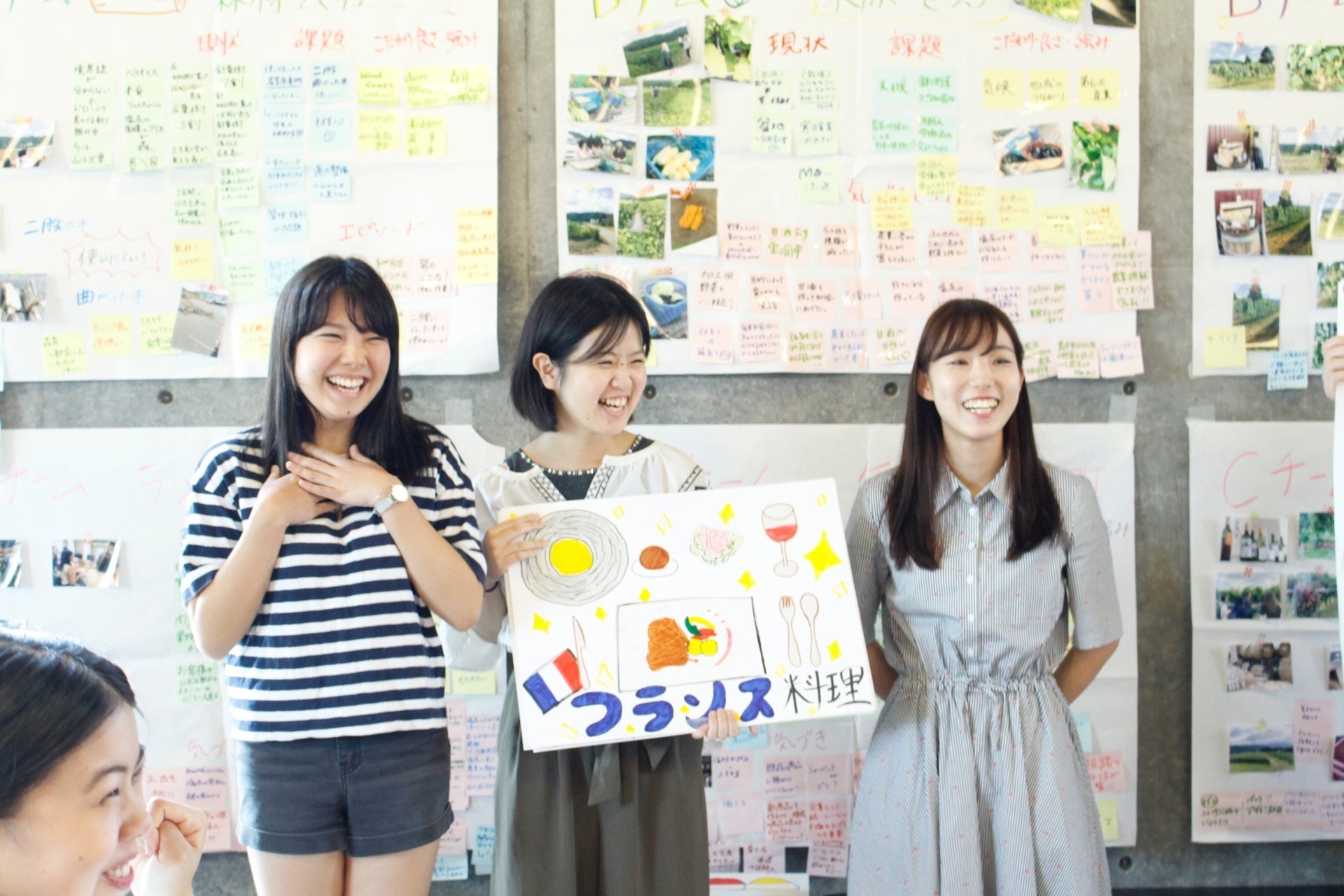まず、班に分かれて今回のスープ作りでご協力いただいた友森シェフのフレンチレストラン「ラ・メゾン・グルマンディーズ」をはじめ、ワイン農家や森林公社など多様な場所に足を運んでインタビューをしながらフィールドワークを行い、そこで実際に見て触れて感じた塩尻の魅力をどんなプロダクトを通して伝えるか考えました。