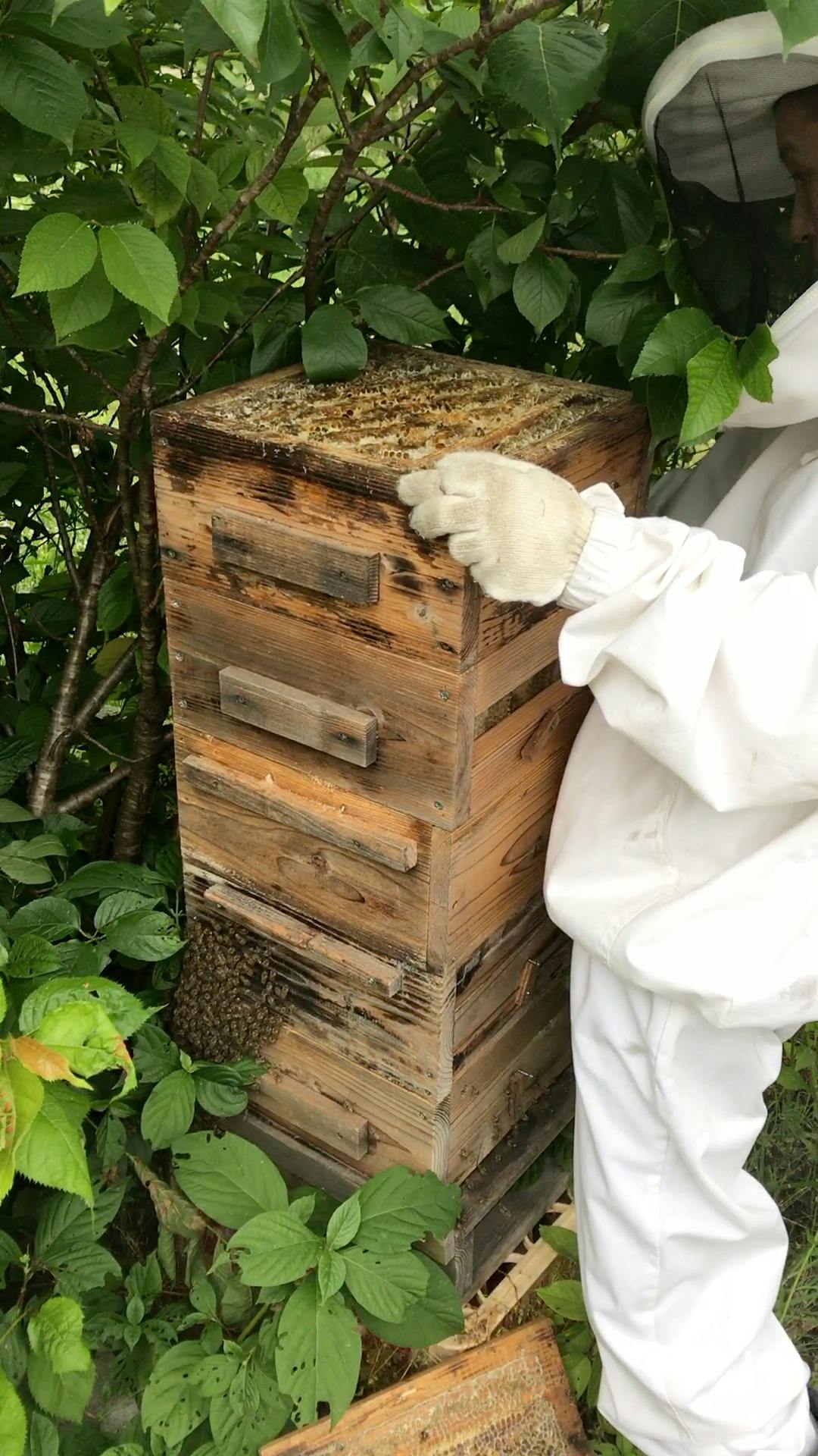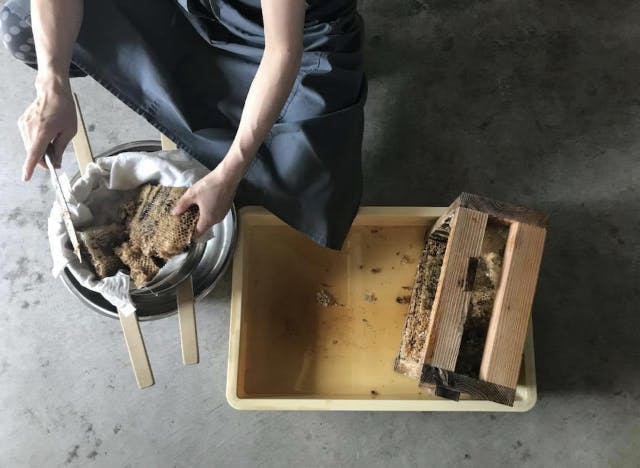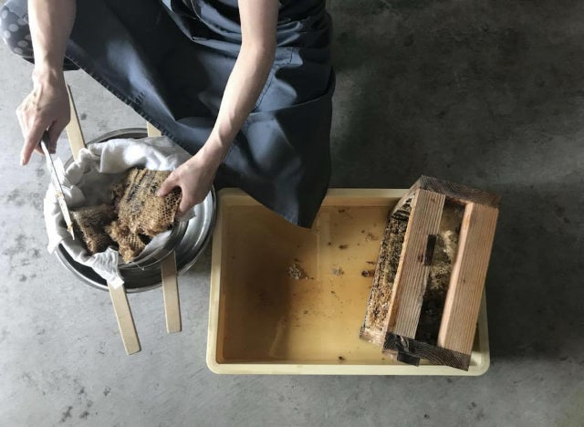 ニホンミツバチとの暮らしは、「ミツバチが住みたくなるような巣箱を用意する」ところから始まります。野生なので気に入らないと出て行ってしまうこともあります。その中で気づいたのは、搾取ではなく寄り添う関係でした。「ミツバチの群が巣箱に落ち着いて無事採蜜時期を迎えると、家賃として蜜の一部をいただく」というのが私たちとニホンミツバチのいい関係です。