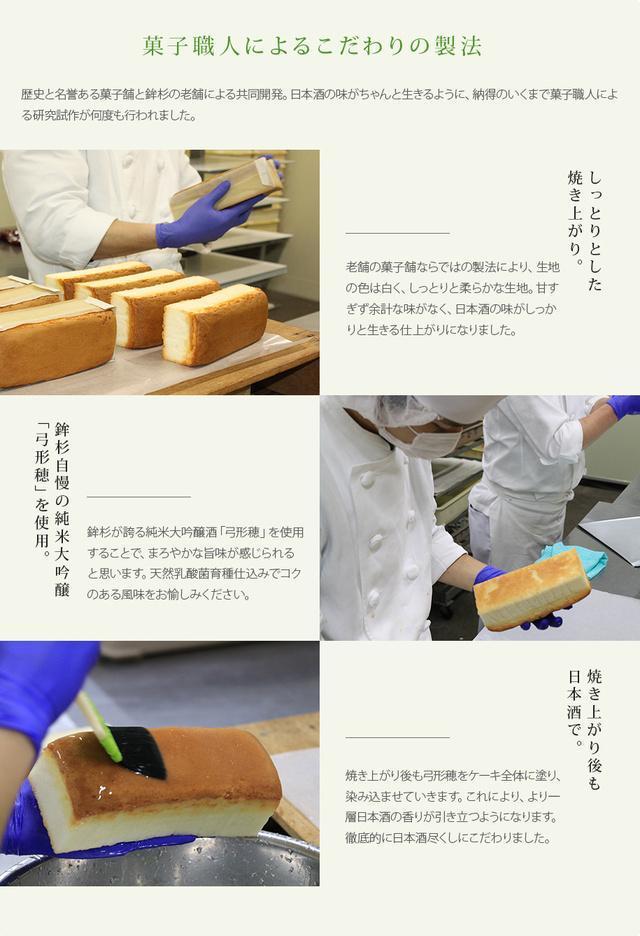 香り柔らかで、丸味とキレを楽しめる味わいの純米大吟醸「弓形穂」を使用したしっとりケーキ。上品な食感、一口食べると日本酒の薫りが口全体に広がる、お酒好きにはたまらない味わい。日本酒の風味豊かなケーキに仕上がりました。
