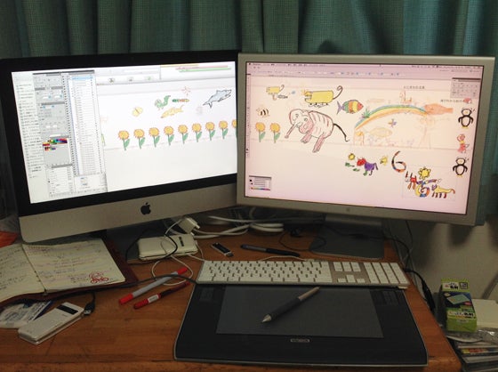 被災地の子供の絵をパソコンに取り込んで作業中です。現在、画面の中にたくさんの絵をどういう大きさでどこに配置するかなど決めています。