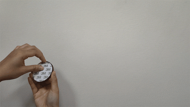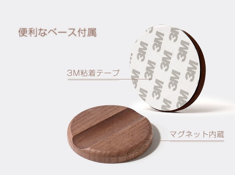 マグネットが内蔵されたベースが付属しているので、平らな場所であればどこでも設置OK。ベースの裏面には強力な粘着力をもちながら、剥がしやすさも兼ね備えた3M製粘着テープを採用しています。