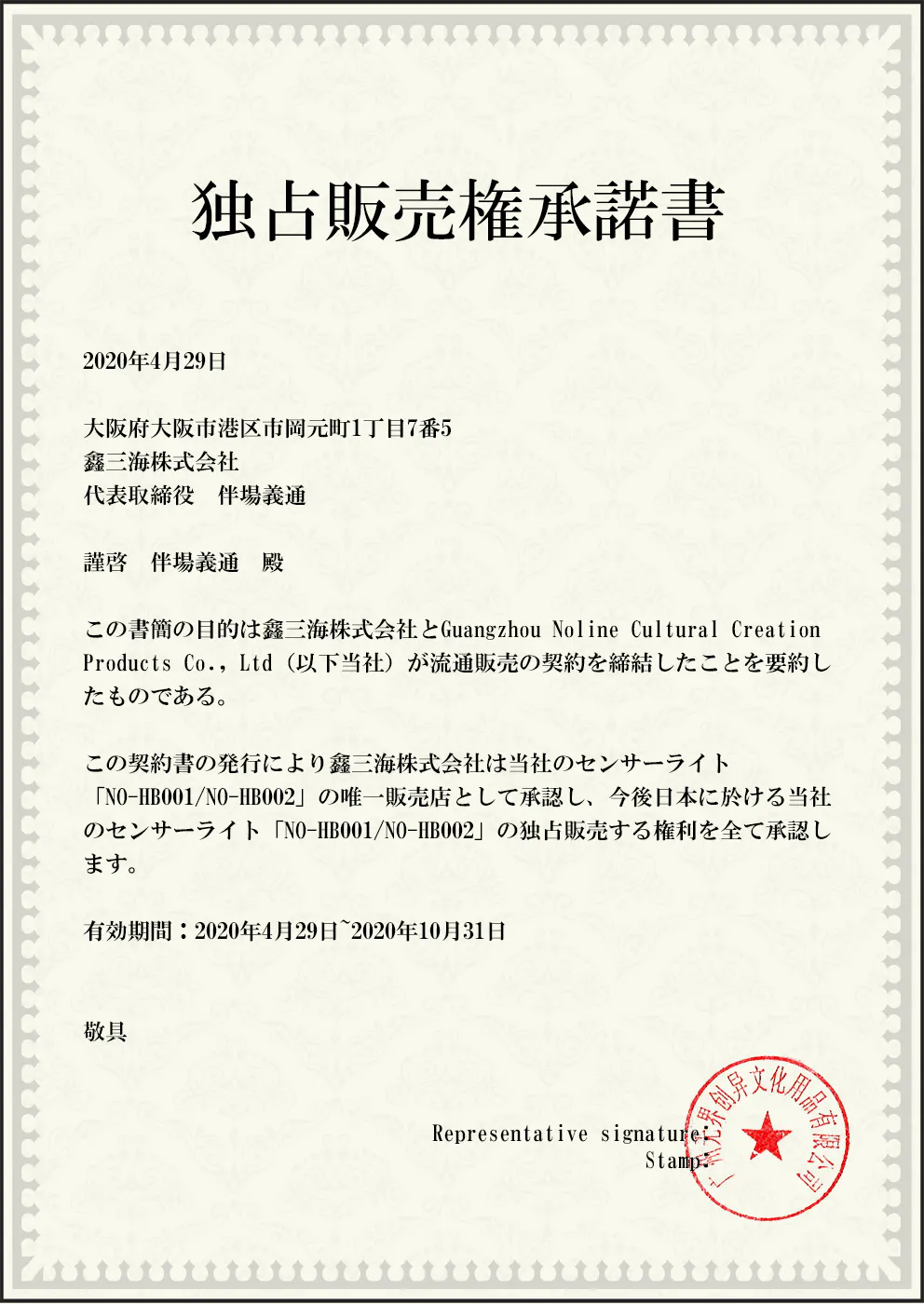この度、NO,LINE社のセンサーライト「NO-HB001/NO-HB002」の独占販売権を取得しており、日本における唯一の正規輸入独占販売代理店として、皆様に製品をお届けいたします。