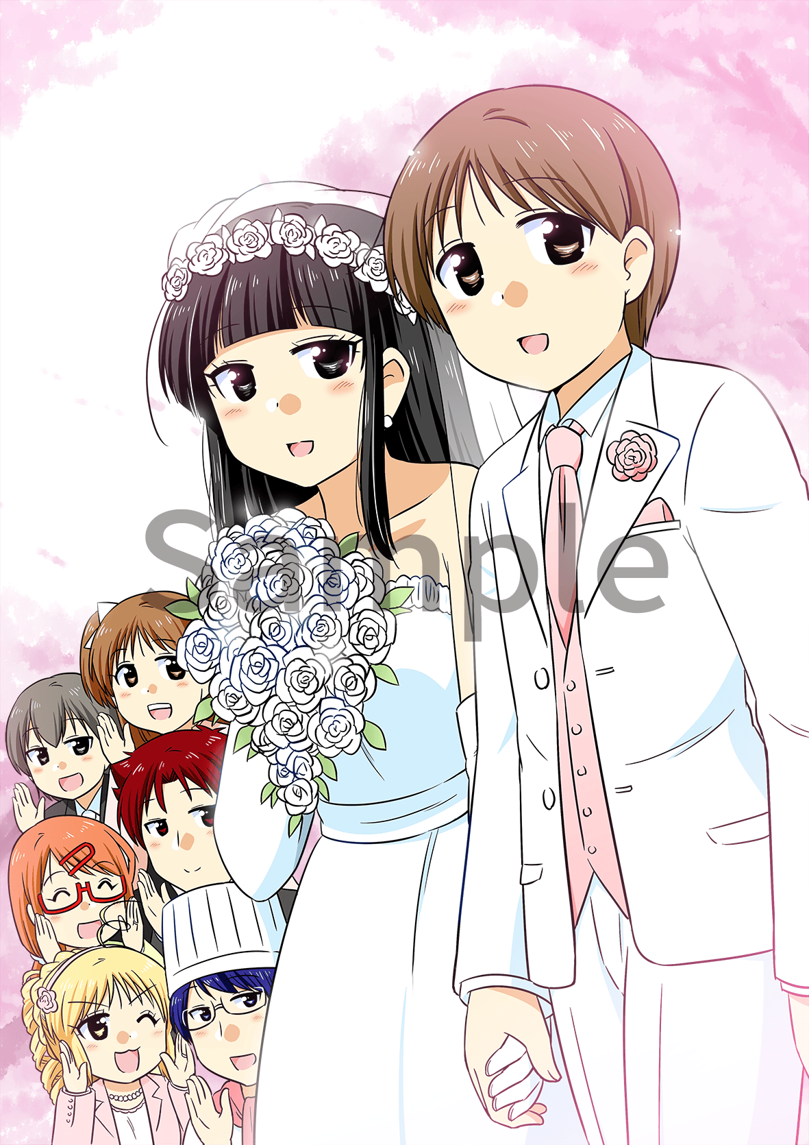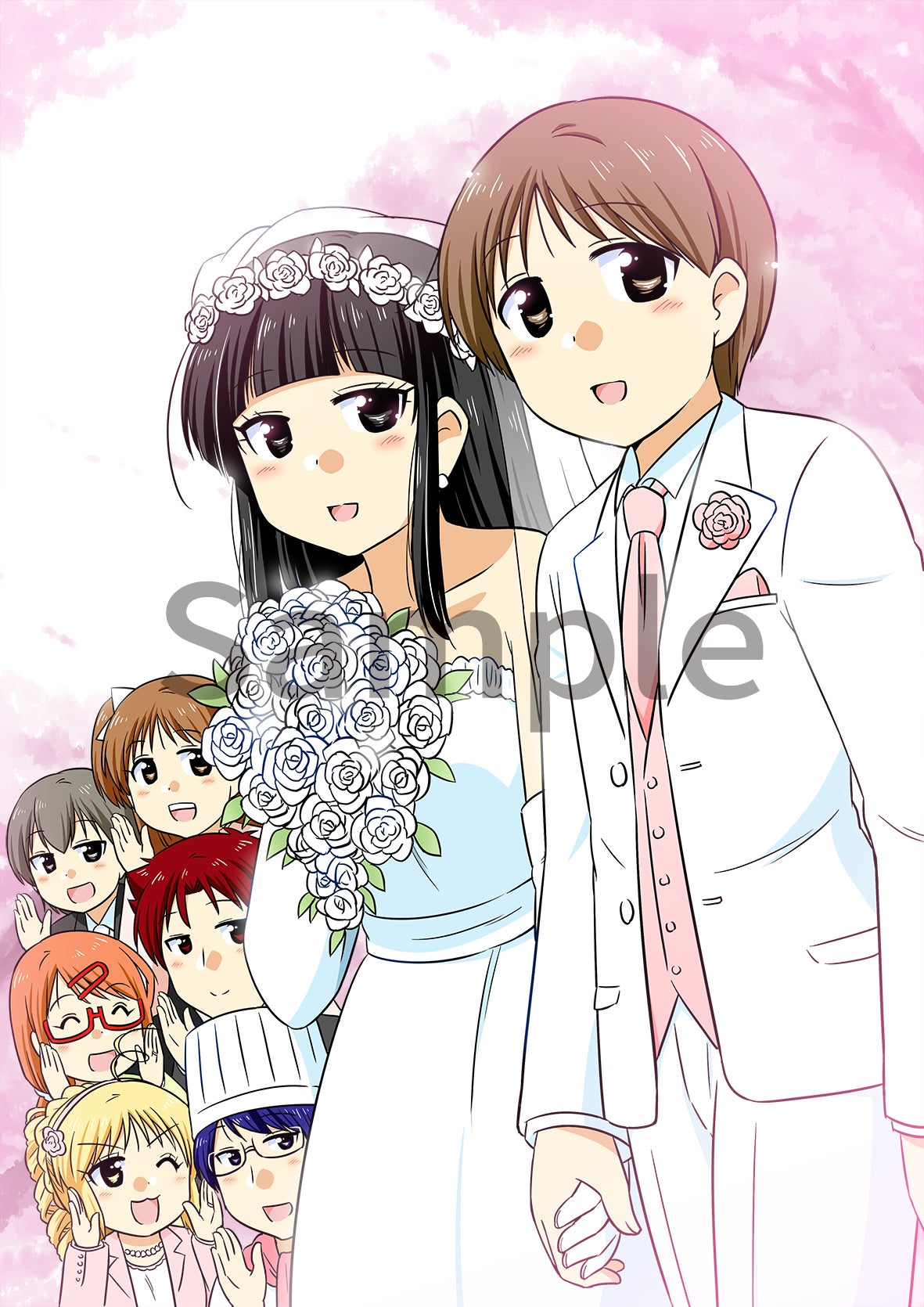 ◆ウッドパネルイラスト→A3の木製パネルに先生描き下ろしイラストをハメ込みます。イラストは、ハッピーエンドにふさわしい各カップルや登場キャラクターの幸せにみちた、結婚式のウェルカムボードの様な、大団円の様子をなるあすく先生に描き下ろしていただきます。