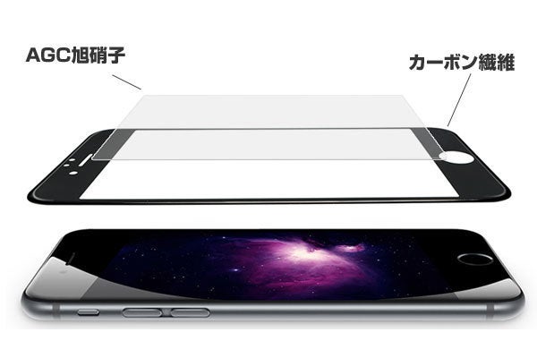 また、ガラス面は旭硝子を用いて表面を守り、縁はカーボンを使用し、これまで問題となっていたガラスフィルム自体の欠損を防ぐ働きをします。