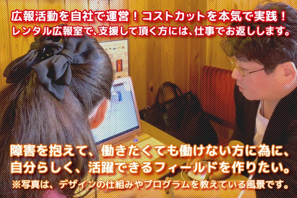 雇用をしようと考えている方達は、学校や会社、社会で傷つけられた方達が多く、設立後に、写真で雰囲気を公開したりお伝えしたりは個人情報もあるのでなかなか難しいです。ですが、デザインのセンスがあったり、パソコン業務に抵抗がなかったりと、少し教えただけでも、一生懸命楽しく業務を行ってくれます。スタート当初は、私がクライアント様の前に出向き、ディレクションの一切を行っていきますが、少しづつ私の会社になじんで頂いて、一緒にお客様の元にお伺いできるよう、仕事の自信も心の自信も育てられたらと思っています。雇用する方達が、色々な形で支援者の方に関われるような会社にしていく予定です。
