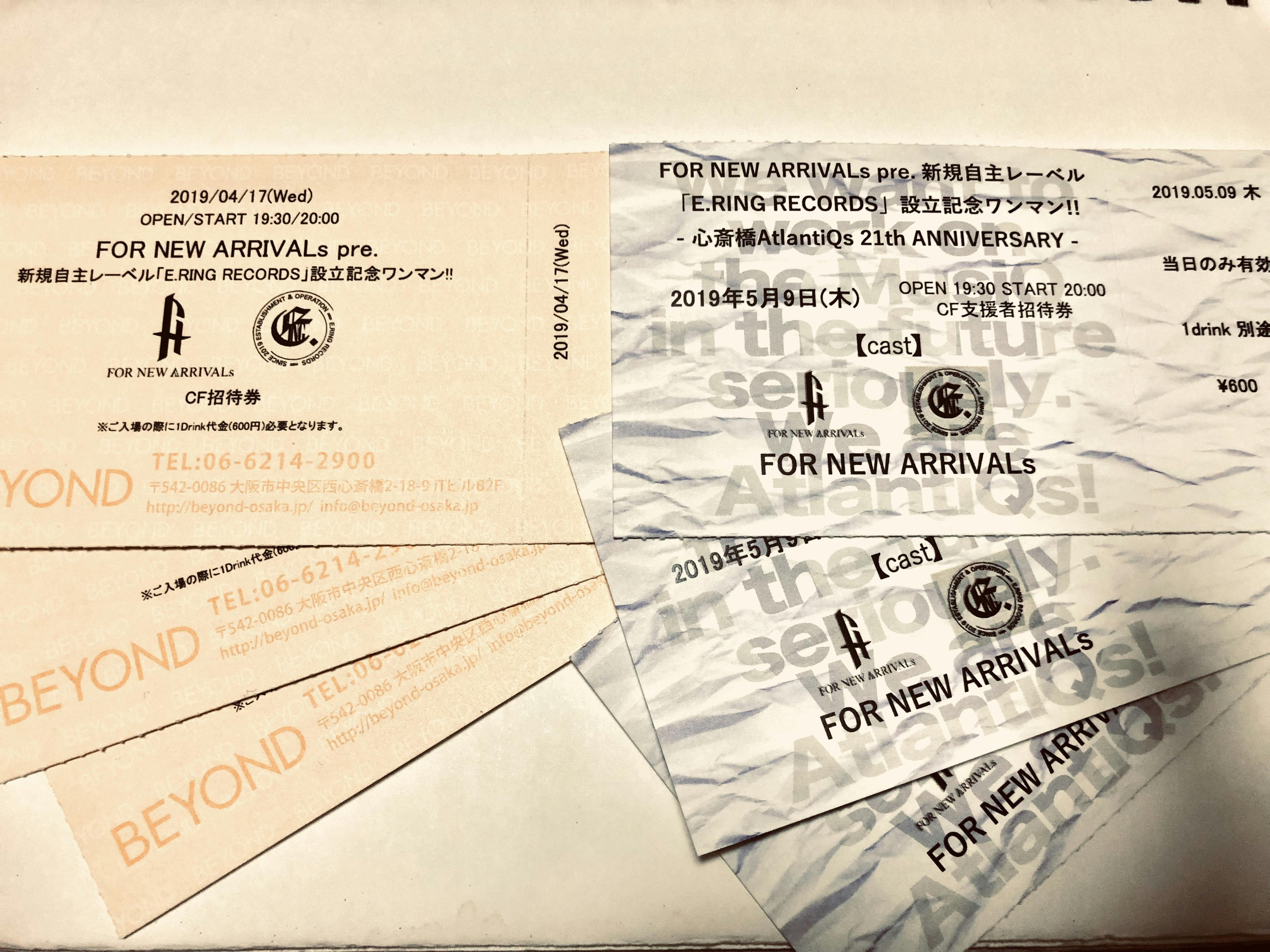 2019/03/05 00:482019.04.17(WED)、2019.05.09(THU)に開催のFOR NEW ARRIVALs pre. 新規自主レーベル「E.RING RECORDS」設立記念ワンマン!!の詳細が決まりました!!CFご支援の方には特製手売りチケットを通常チケット価格より¥500 OFFにてお届けしておりますので、ご来場予定の方は是非CF実施期間中にGETしてください!!--------------------2019.04.17(WED)@アメリカ村BEYONDFOR NEW ARRIVALs pre. 新規自主レーベル「E.RING RECORDS」設立記念ワンマン!!- BEYOND 1st ANNIVERSARY -OPEN/START 19:30/20:00 ADV/DOOR ¥3,000/¥3,000(別途1DRINK代 ¥600-)※CF支援者の方には特製手売りチケットを郵送にてお届けいたします(入場時D代のみご用意ください)--------------------2019.05.09(THU)@アメリカ村BEYONDFOR NEW ARRIVALs pre. 新規自主レーベル「E.RING RECORDS」設立記念ワンマン!!アコースティック編 - 心斎橋AtlantiQs 21th ANNIVERSARY -OPEN/START 19:30/20:00 ADV/DOOR ¥3,000/¥3,000(別途1DRINK代 ¥600-)※CF支援者の方には特製手売りチケットを郵送にてお届けいたします(入場時D代のみご用意ください)---------------------各公演についての注意事項-※CF支援者の方には特製手売りチケットを¥2,500プランのリターンとしてお渡ししています。CF終了後は¥3,000にてチケット取り置きを開始致します。※CF支援にてチケット購入の方はワンマンのリハーサルの一部を見学可能、また一部プランおリターンとして終演後メンバーとの打ち上げも有ります!!!!(リハーサルは見学は18:00-18:30、打ち上げ・乾杯は物販終了後22:00〜を予定しております。詳細及びリハーサル・打ち上げへのご参加希望の有無を、改めてCF支援者様に後日メールにてお知らせ致します) もっと見る