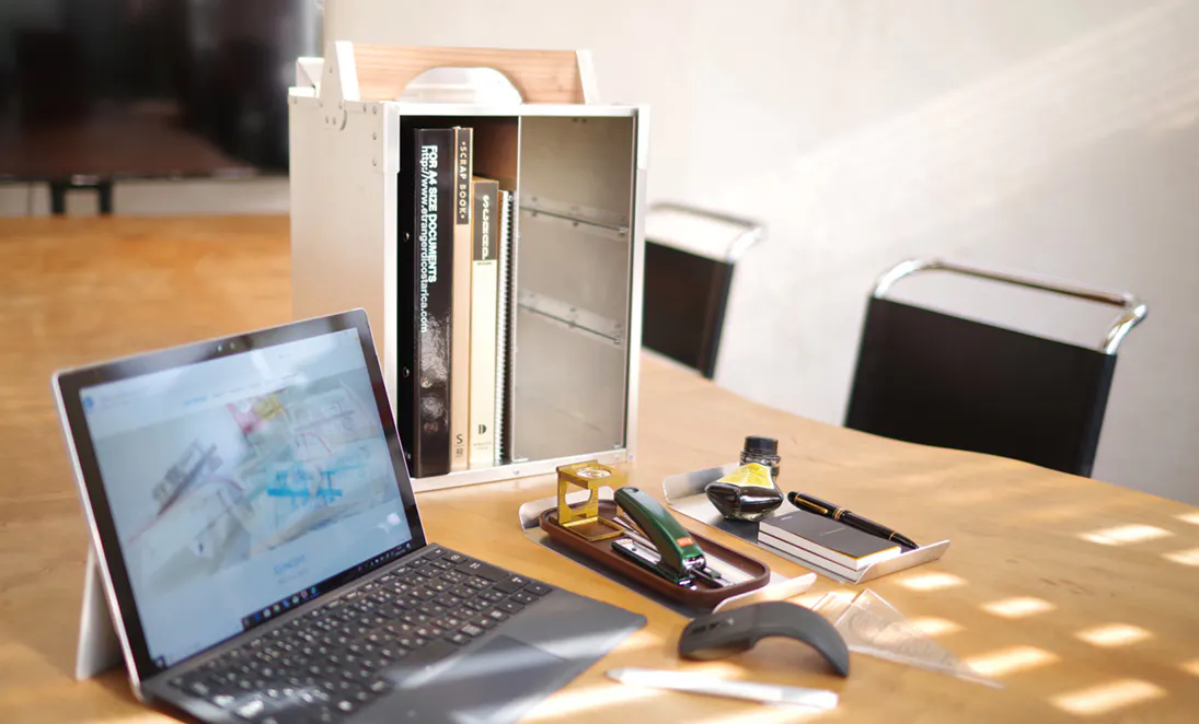 「ヘイお待ち!」プレゼンの移動も「オカモッティ」なら簡単。必要な資料やPC、マウス、電源やケーブルなども、片手で持ち運びが可能です。