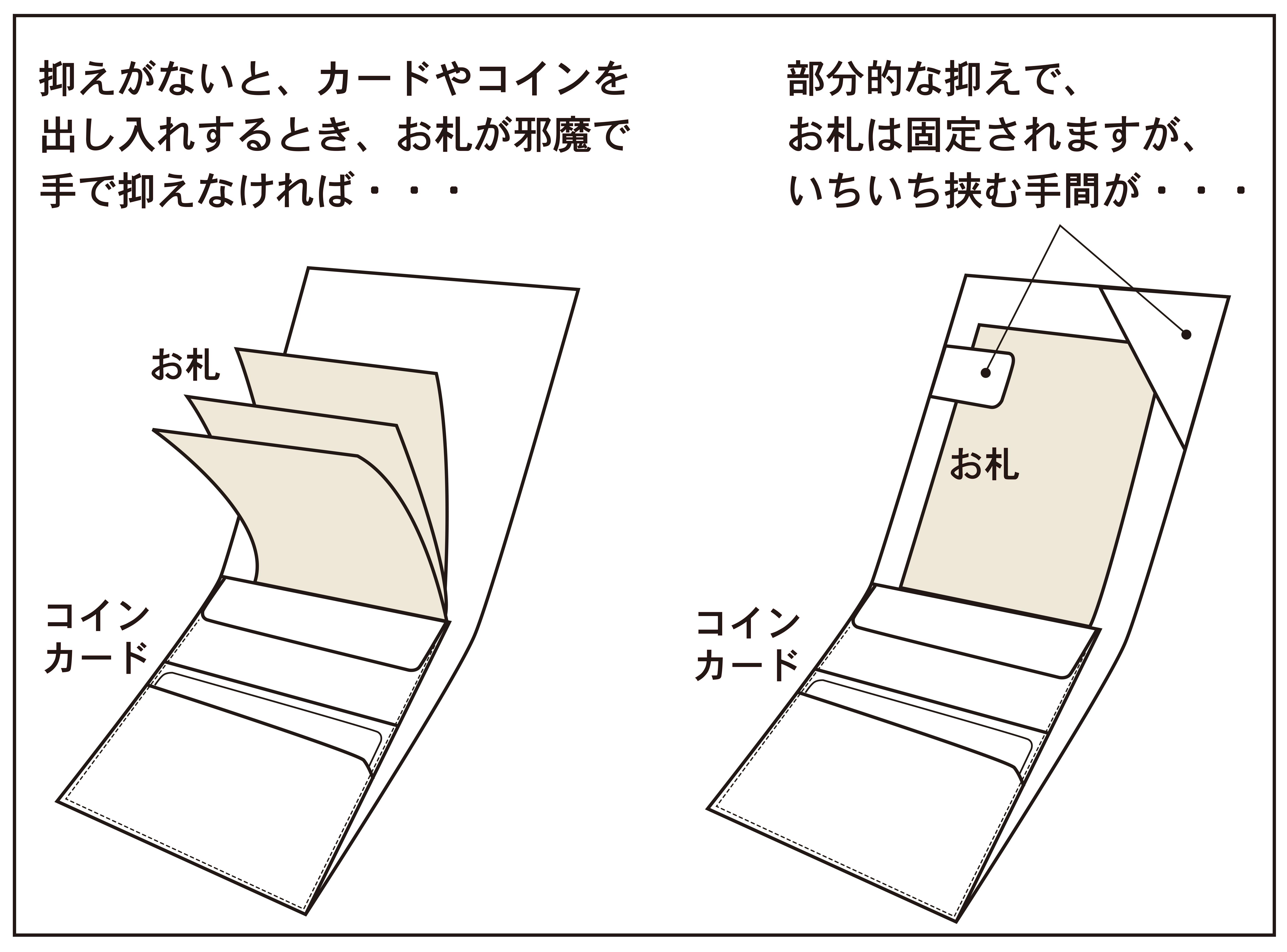 さらにカードや小銭を出すときも抑えになり、お札が邪魔になりません。