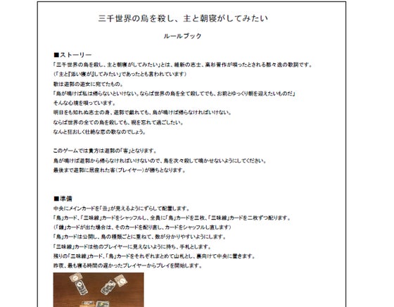ルールブックの掲載期限が近づいていますので、再アップします。 ■三千世界の烏を殺し、主と朝寝がしてみたい-ルール http://fast-uploader.com/file/6965220497424/ (9/16まで) 再アップにあわせて文言の統一、分かりにくい説明の修正などを行っています。 掲載期限は本プロジェクトの終了期限にあわせています。 残り二週間、非常に厳しい状況ではありますが応援よろしくお願いします。 イラストも修正を掛けたいのですが、なかなか時間が取れず。 なるべく早く見直します。 プロジェクト終了間際ではありますが、イベントへの出席を考えています。 ■第四回・大阪ボドゲフリマ http://www49.atwiki.jp/bgrecycler/ 9月14日(日) 新大阪にてボードゲームのフリーマーケット・イベントが開催されます。 本プロジェクトとして試遊台を設けますので、ぜひ体験してください。 2卓を予定しています。 ■【京都イベント】9/15(月祝)京町家でボードゲームしませんかっ!【町家ゲーム会(仮)】 http://yaoyolos.seesaa.net/article/403842712.html 9月15日(月) 京都の町家でゲーム会があります。 「京都より幸せを運ぶアイドル」こと、やおよろズが主催するイベントです。 町家でゲーム、と言われれば参加しないわけには行きません。 できれば着物で参加できれば、とか考えていますが実際にどうするかは体力次第です。 とりあえずボドゲフリマに向けて、持ち込む椅子を買い出したり、机を洗ったりしています。 (会場から何も借りられないので、全て持ち込みのため) あとは名刺も作らないと・・・ 個人で全部やっているので色々抜け漏れなどあるかも知れませんが、何卒ご容赦ください。 問題点がありましたらご指摘頂ければ幸いです。 あと、ゲームの感想や、ゲームが遊べる場所の情報などをまとめています。 ぜひご覧ください。 ■三千世界の烏を殺し、主と朝寝がしてみたい - Togetterまとめ http://togetter.com/li/709781