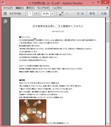 「ルールの詳細が分からない」という声を複数頂いています。 まずは興味を持って頂いてありがとうございます。 本当ならプレイ動画・解説動画をアップするべきなのですが、 一度撮ったものは余りに残念な出来なので、改めて取り直してアップします。 代わりと言っては何ですが、ルールブックの原稿をPDF化しましたので こちらを公開させて頂きます。 http://fast-uploader.com/file/6962716566134/ ( 9/4まで公開) まだデザインを入れていないため殺風景ですが、内容としてはルールを網羅したものになっています。 ご興味をお持ちの方は、ぜひ内容をご覧いただけましたら幸いです。 ※そんな事を書いていたら「プレイ動画撮りましょうか」というお申し出を一件いただきました。 有り難い! なんと、世の中捨てたものではないですね。 弱音を上げて一日足らず、思わず泣きそうになりました。