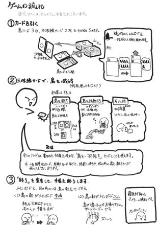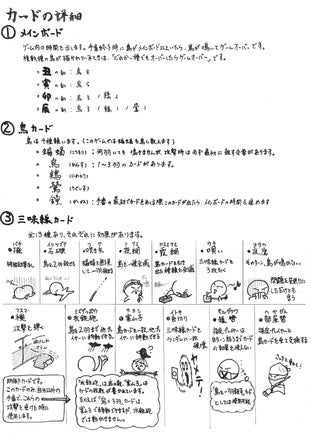 ゲーム内容をイラストで分かりやすく説明する資料を作りました。 イラストを描くことなど無いので、拙い部分はあるかと思いますが、 これでゲームのイメージを掴んで頂ければと思います。 データはPDF形式でアップしています。 以下よりダウンロードください。 ・「三千世界の烏を殺し、主と朝寝がしてみたい」説明イラスト http://fast-uploader.com/file/6963543467607/ 「この形式のファイルで欲しい」 「このサイトにアップしてくれたらもっと見やすい」 等、ご意見・ご要望がありましたらメッセージ頂けますと対応させて頂きます。 よろしくお願いします。 【以下、雑談(この資料を作った背景)】 盆休み、ということで久しぶりに高校の友人と飲んだのですが、 そこでこのプロジェクトの話題になりました。 友人曰く、 「長い文章なんて読んでられない」 「マニュアルなんか面倒で読まない」 「動画も一・二分を超えると見ない」 な、なるほど・・・ ゲームのルールを説明したつもりでも、全然伝わっていないんだと痛感しました。 で、その場での結論が 「イラスト付きの分かりやすい説明資料を作って欲しい」 という話でした。 イラスト・・・ こんなイラストは苦手なのですが、逃げるわけにも行きません。 子供の宿題を見つつ、仕上げました。 痛感したのはボードゲーム好きと、ボードゲームを知らない・やらない方との温度差です。 苦手だからと逃げずに、積極的にニーズのあるものには対応していきたいと思いますので、ご意見・ご要望はお気軽にいただけましたら幸いです。 もちろん出資されない方からでも大歓迎です。 今後とも応援よろしくお願いします。 ※それにしてもこんな文章を書くと、また友人から「長い」と言われそうですが。