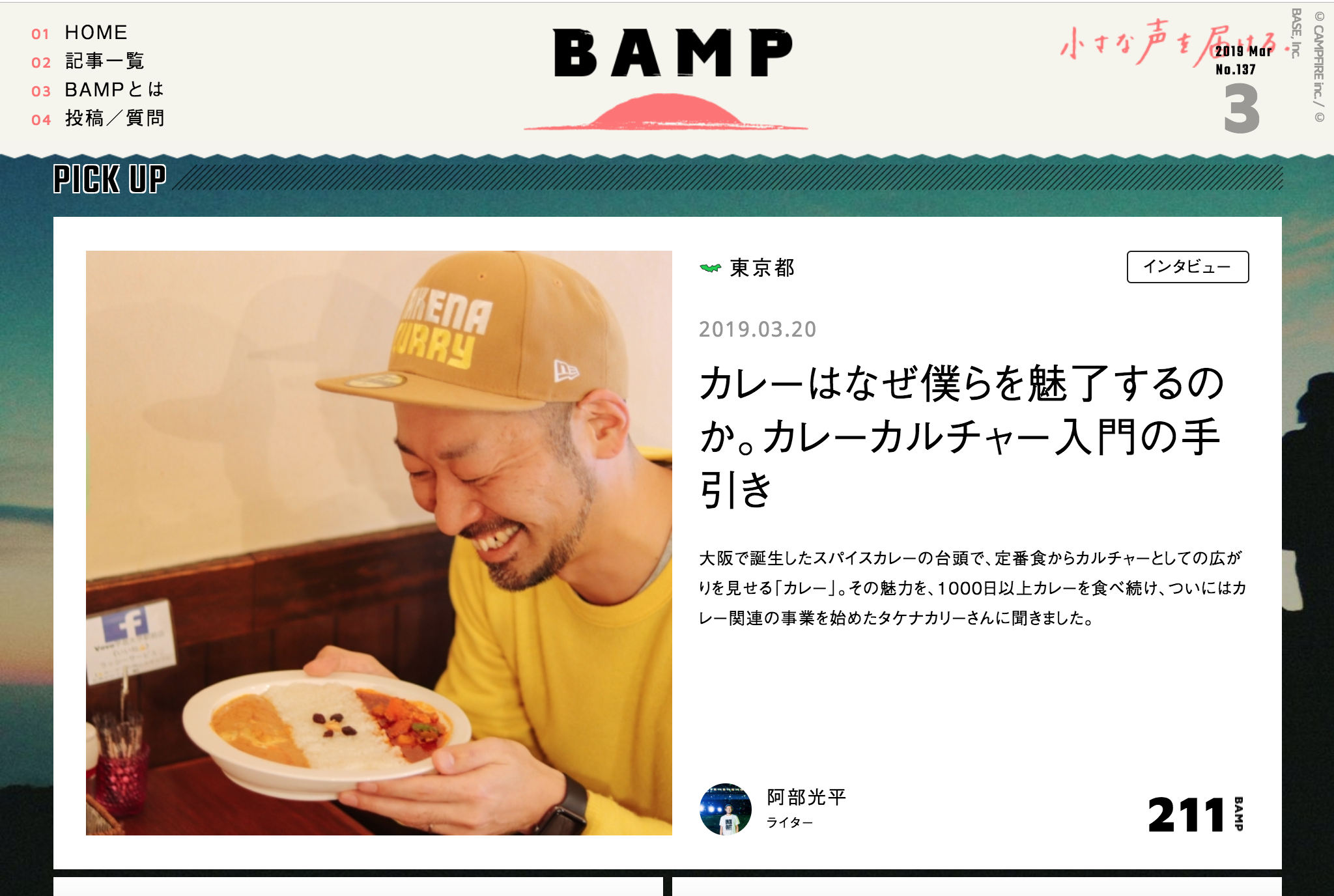 小さな声を届けるウェブマガジン「BAMP」にて、タケナカリーのインタビュー記事が公開されました! ▶︎カレーはなぜ僕らを魅了するのか。カレーカルチャー入門の手引き今や定番料理という枠を超え、カルチャーとして定着しつつあるカレー。その魅力について、カレー作りと音楽制作の関係、カレーと民俗学などなどたっぷりとお話しさせていただきました。ライターの阿部光平さん、編集の友光だんごさん、いろんな話題が混ざりまくったカレーのような取材をおいしく調理していただいてありがとうございました!そして機会をくださったBAMP編集長の徳谷柿次郎さん、取材場所にご協力いただいたVOVOさんにも大感謝!取材時は特別にCHANCE THE CURRYのカレー皿に盛り付けていただきました!VOVOさんありがとうございました!カレーの面白さ、届け〜〜〜!!!クラウドファンディングも、終了2019年3月30日まで残すところ<あと10日>!皆さま、引き続きどうぞよろしくお願い致します!