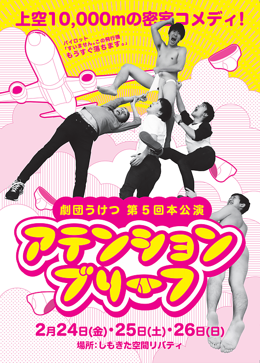 一昨年2017年は、飛行機墜落密室コメディ、第5回本公演『アテンションブリーフ』を上演しました。(音楽には、有名歌手、アイドルなどのバックバンドなども務め、東京を拠点とするインストバンド『The Room is Mine』(http://theroomismine.com)から楽曲を提供していただき、それ以降の公演でもご協力いただいています。