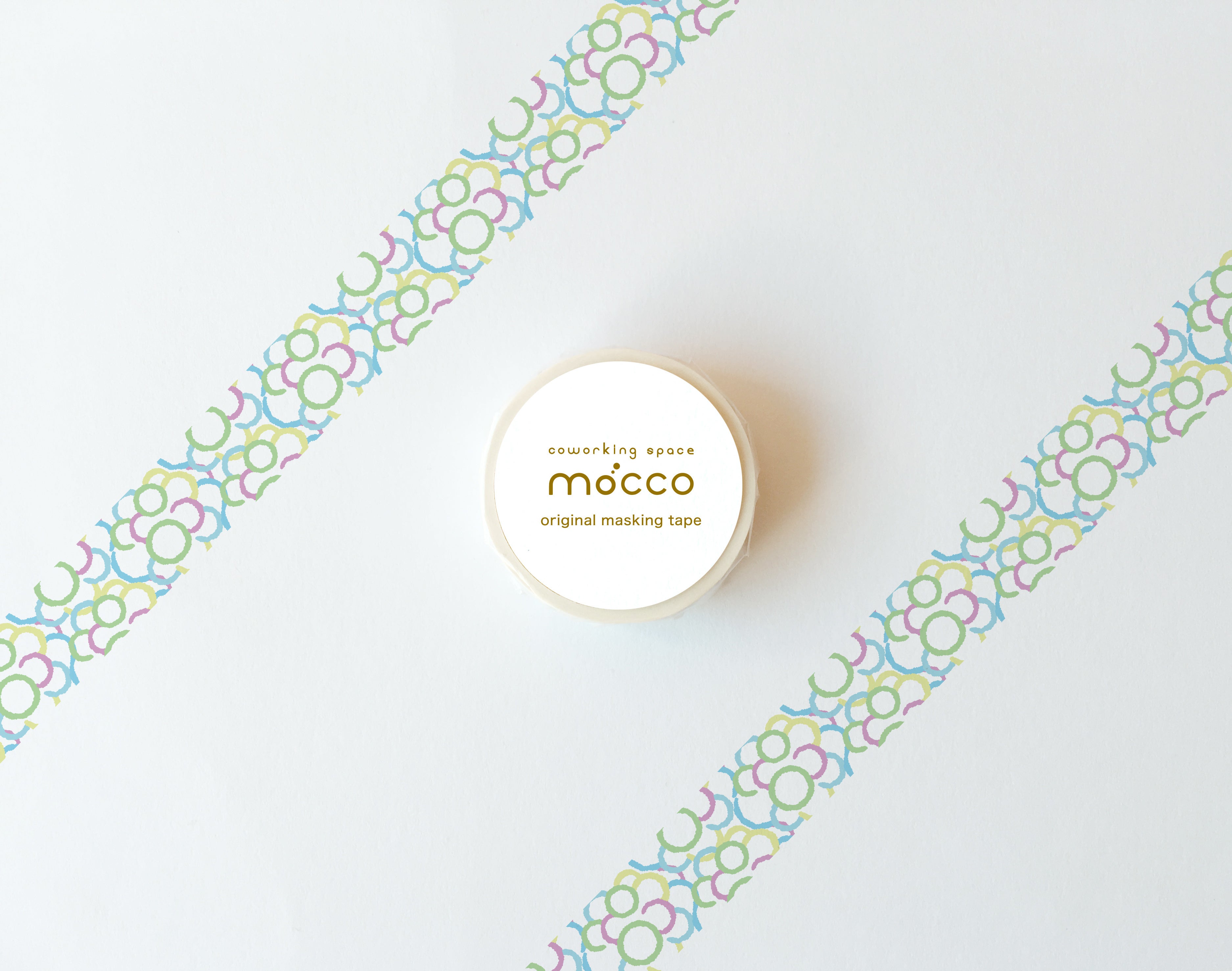 ベースの白にmoccoのロゴである雲マークを全体に配置し、カラフルでかわいいマスキングテープに仕上がっています♪