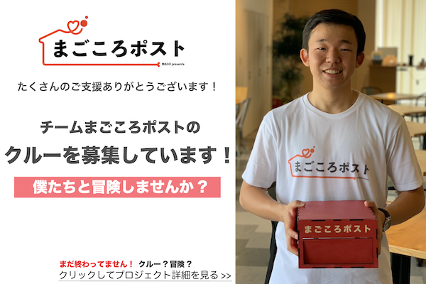 また、支援よりも“まごころポスト”を作りたい!僕たちと一緒にこれからワクワクしながら冒険したい!という仲間も大歓迎です。
